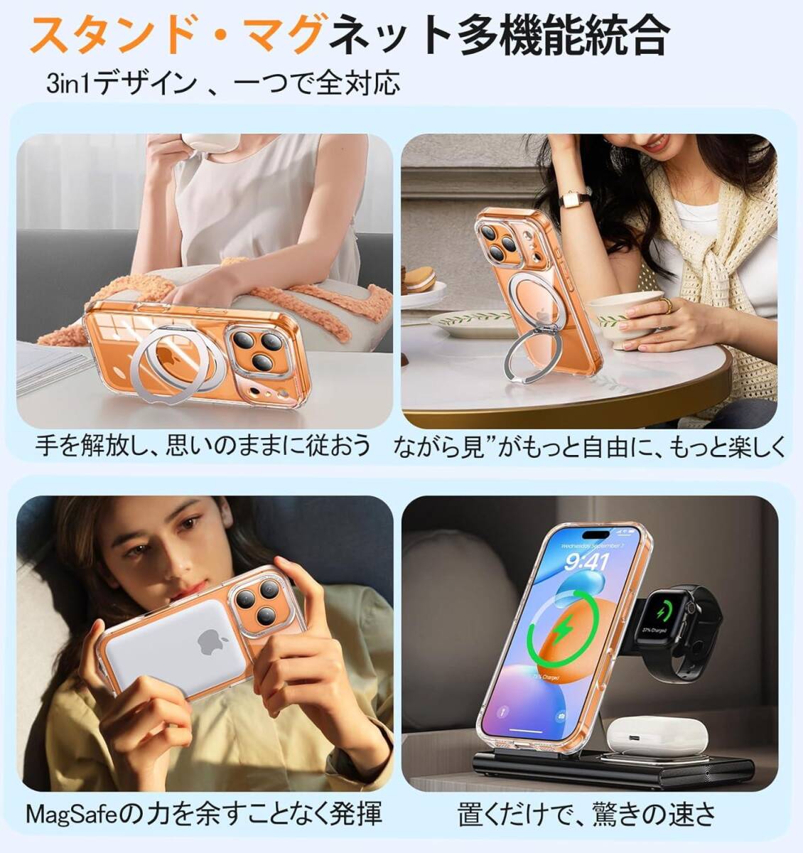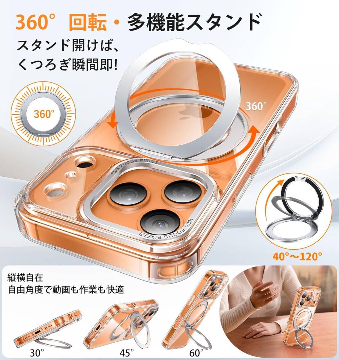 | 対応機能 | MagSafe対応, ワイヤレス充電対応, 360°回転スタンド, 縦横両対応, 防指紋コーティング |