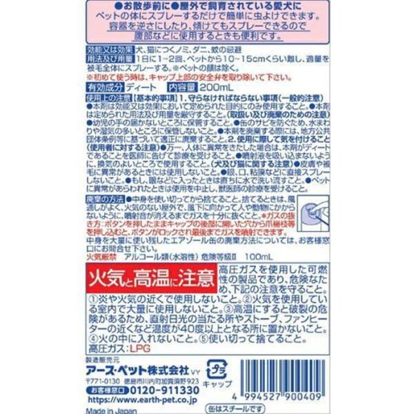 対象:犬、猫 機能:動物用医薬部外品 ■特長 ●ペットの体にスプレーするだけで簡単に虫よけできる防虫スプレーです。 ●容器を逆さにしたり、傾けてもスプレーできるので腹部などに使用するときも便利です。 ●フローラルの香りです。 内容量:200ml 有効成分:ディート 生産国:日本 【ご注意】 ※本品は犬猫用の虫除けスプレーですです。目的以外の用途では使用しないでください。 ※高圧ガスを使用しています。高圧ガス:LPG |