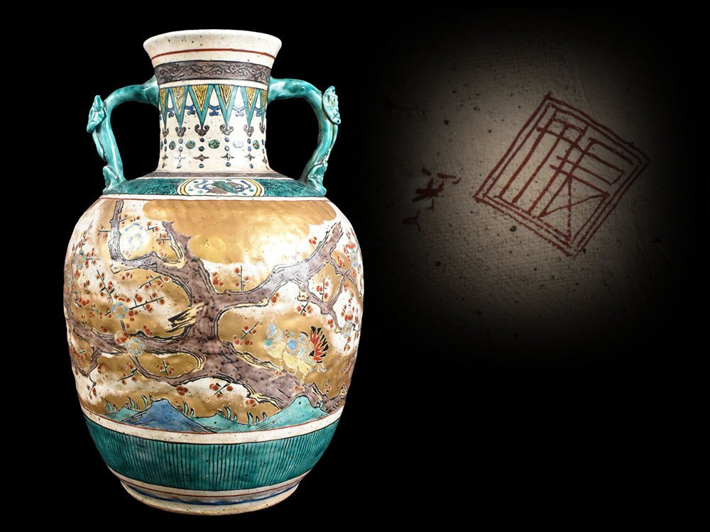 | 商品名 | 【雲】某収集家買取品 九谷 色絵金彩梅鳥絵付耳付大花瓶 飾壷 高さ47.5cm 角福 古美術品(花器花入吉田屋再興)DJ880 UThjngdk |