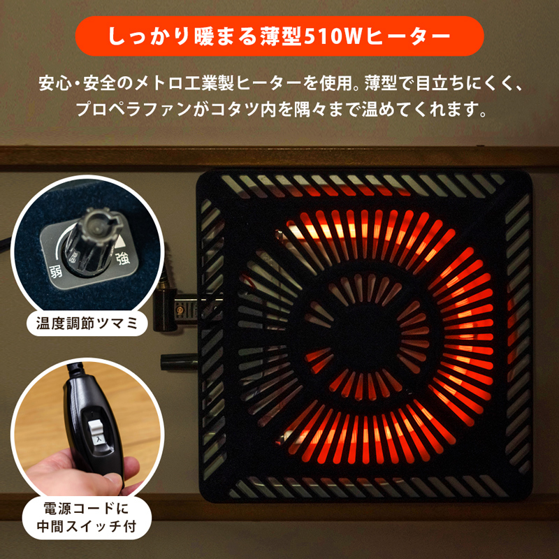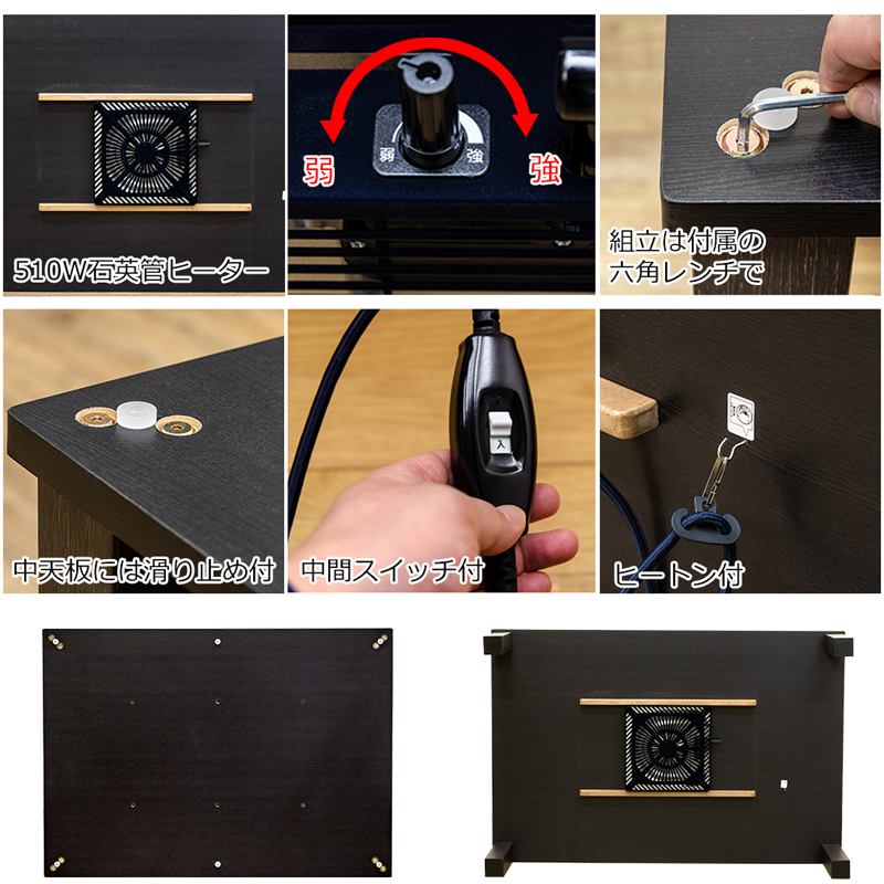 | 材質 | OAK天板:強化紙化粧繊維板、MWH・WAL・WH天板:合成樹脂化粧繊維板(PVCシート貼り) 中天板:22mm厚プリント紙化粧繊維板(フラッシュ構造)、脚:中密度繊維板(表面PVCシート) 510W 石英管ヒーター、コード長さ3.1m(中間スイッチ付) |