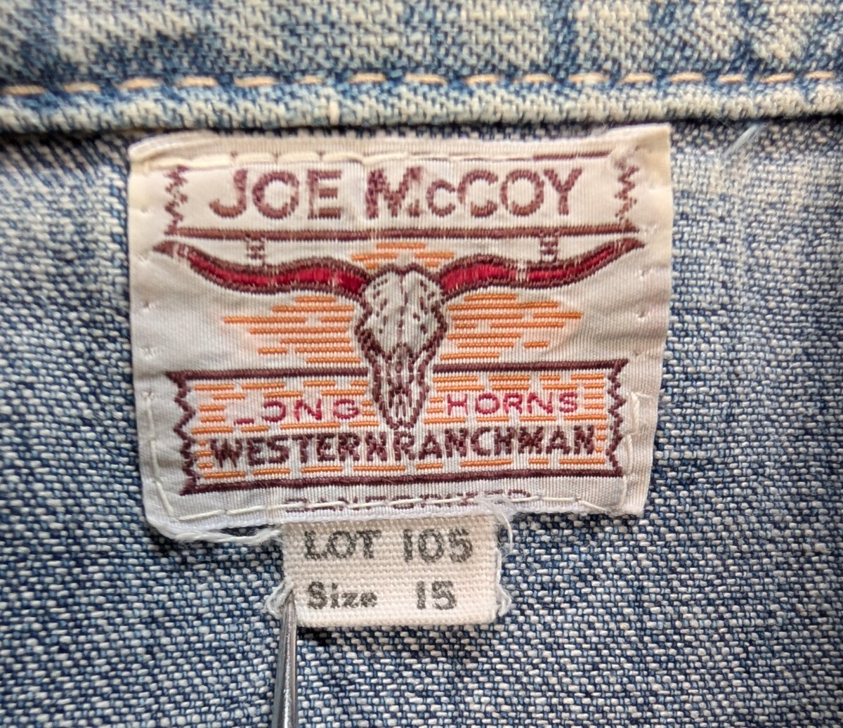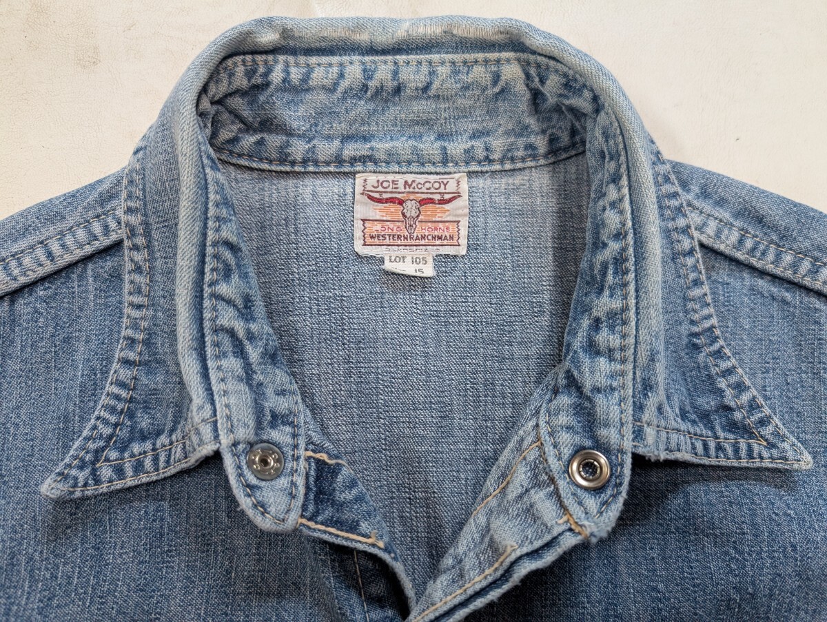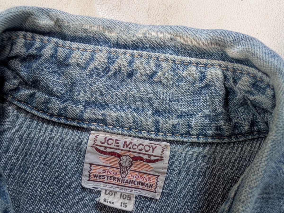 JOE McCOY★ ジョーマッコイ デニム シャツ ★ ロングホーン ウエスタン シャツ ★ サイズ 15 ★ 実寸サイズ 肩幅 約45cm位、身幅 約52cm位、袖丈 約60cm位 着丈 約72cm位 襟より先端まで ★ 襟部分に傷み有り 全体に色落ちしてます ★ 画像にてご確認くださいませ |