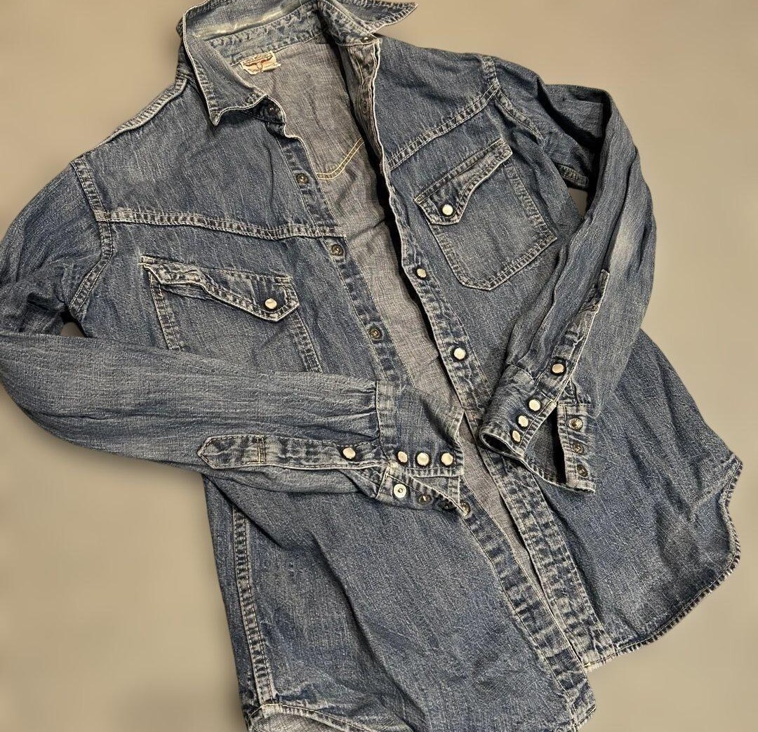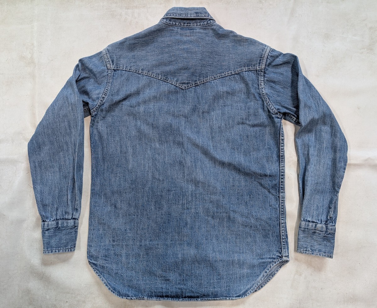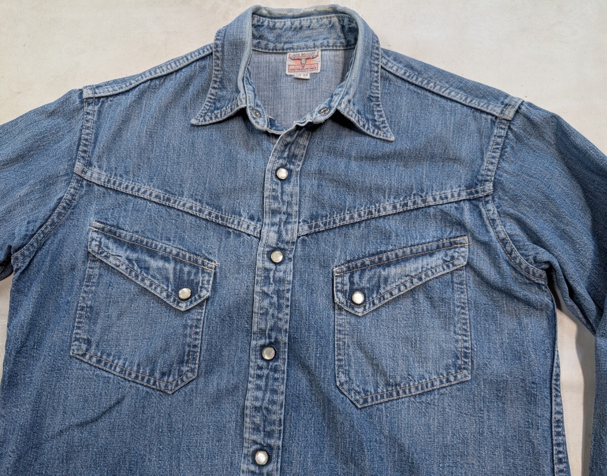 JOE McCOY★ ジョーマッコイ デニム シャツ ★ ロングホーン ウエスタン シャツ ★ サイズ 15 ★ 実寸サイズ 肩幅 約45cm位、身幅 約52cm位、袖丈 約60cm位 着丈 約72cm位 襟より先端まで ★ 襟部分に傷み有り 全体に色落ちしてます ★ 画像にてご確認くださいませ |