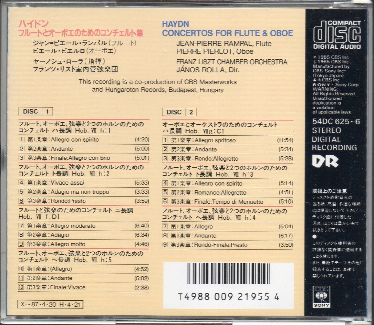 -当演奏は、廃れてしまったリラ・オルガニザータの代わりに フルートとオーボエで演奏したもので、なんとランパルとピエルロにとって再録音とのこと。結構思い入れがあるのでしょうか。-いずれも明るく娯楽的な曲ですが、[4]の第2・3楽章は交響曲第89番に、[6]の第2楽章は交響曲第100番「軍隊」の第2楽章に転用されたというのが興味深いところ。知らずに[6]を聞いて驚きました。てっきり交響曲からの転用と思っていましたが、逆であるとのことでさらに “驚愕” しました (曲は “軍隊” ですが)。