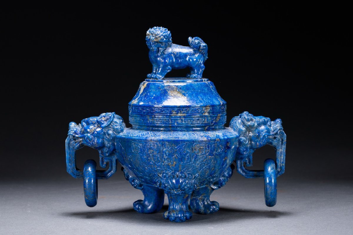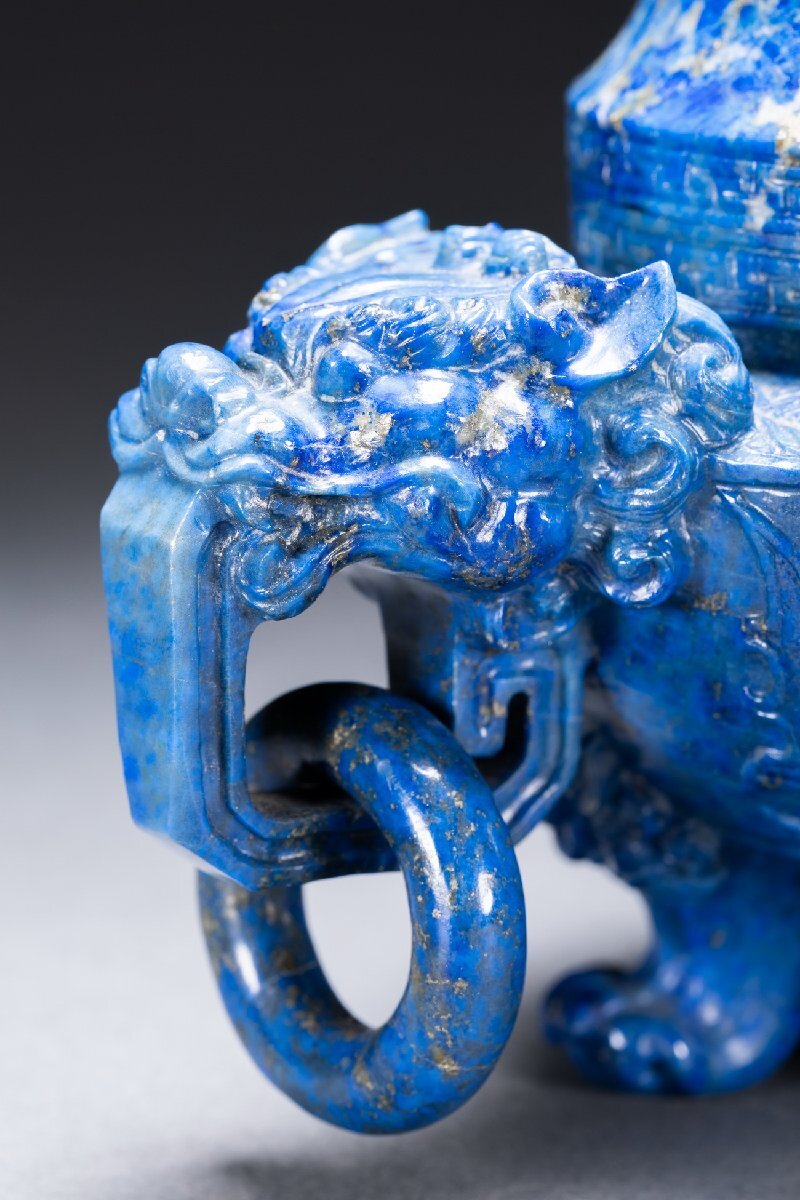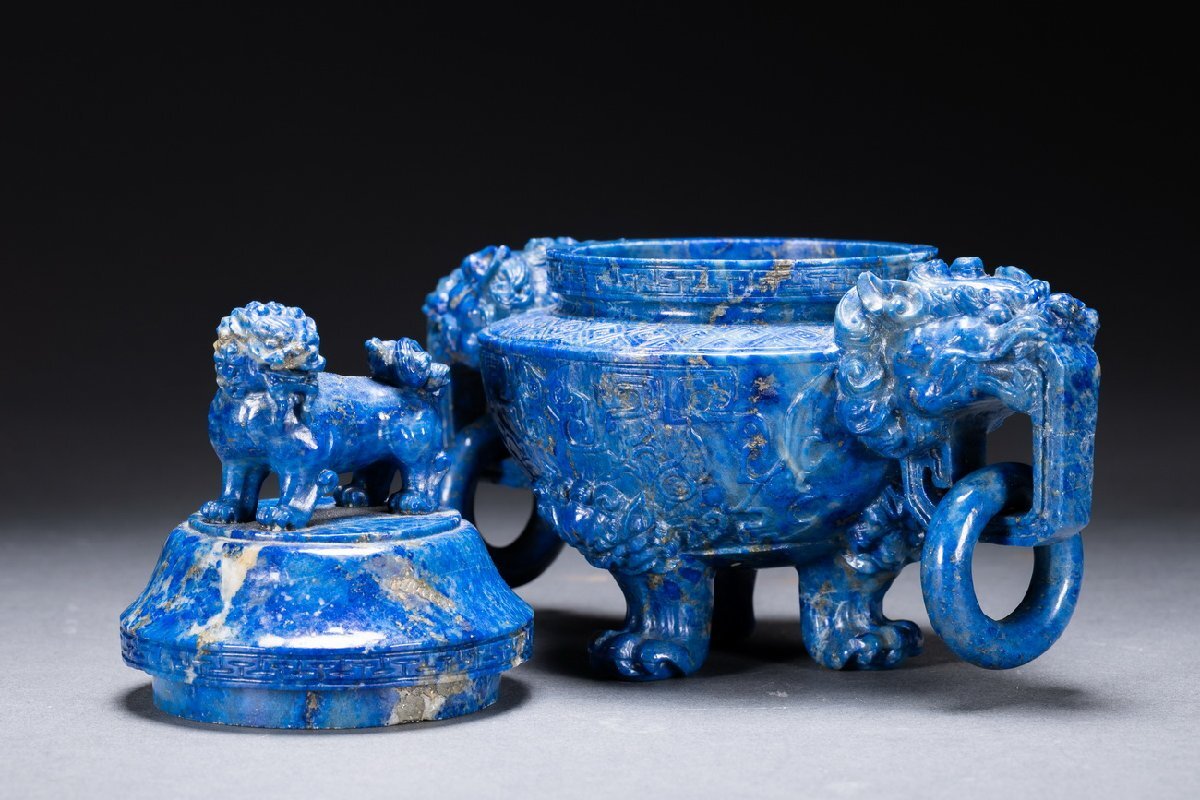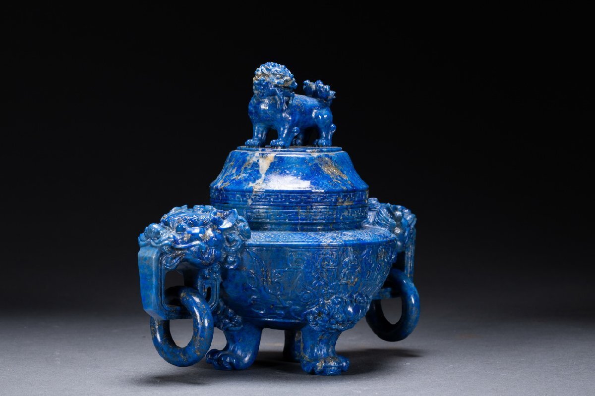 【雲錦】某有名オークション購入 清時代 中国伝来 天然青金石 唐獅子鈕 双環耳蓋爐 材質保証 古置物 古美術 時代コレクション7L10-165S10