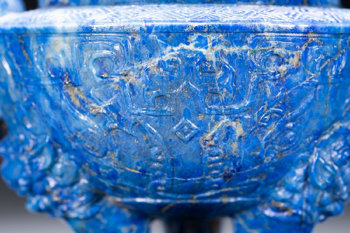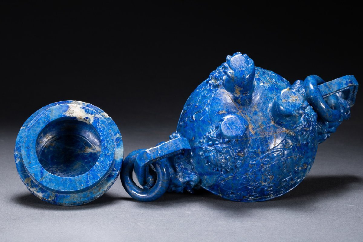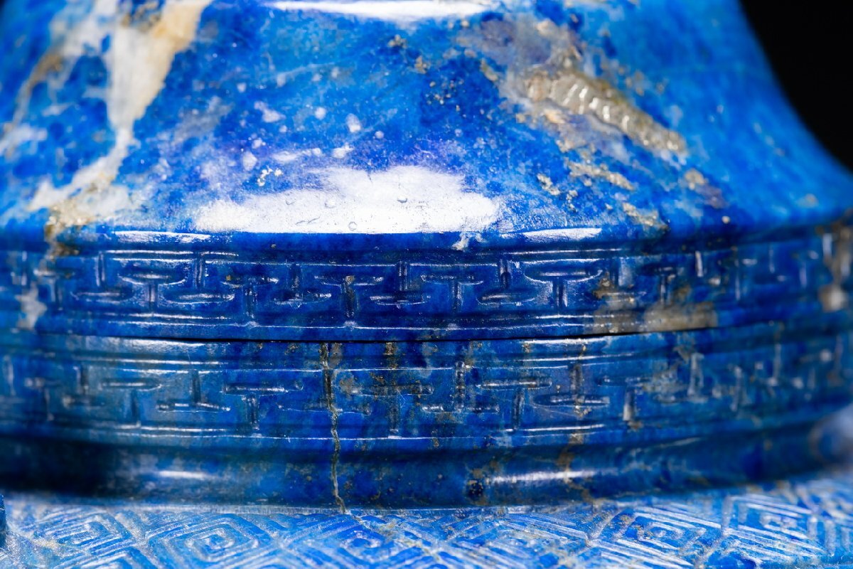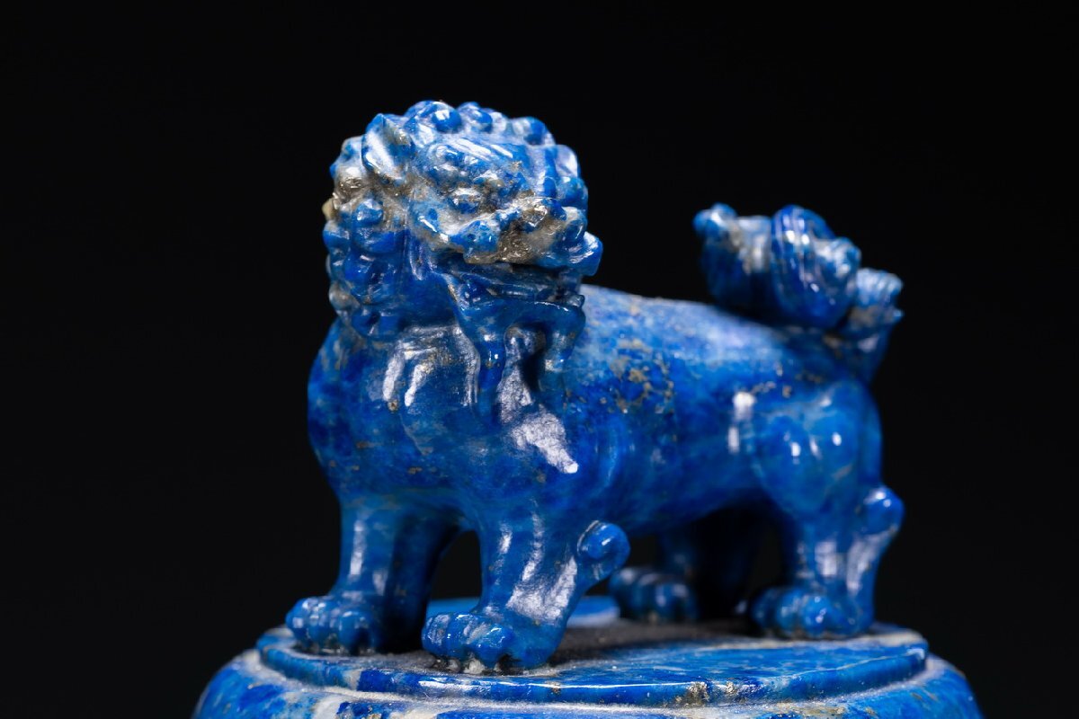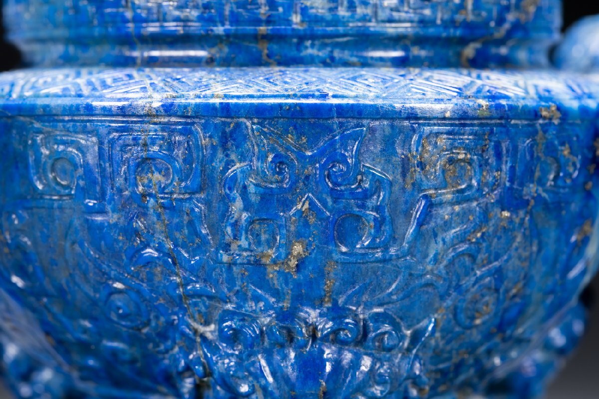【雲錦】某有名オークション購入 清時代 中国伝来 天然青金石 唐獅子鈕 双環耳蓋爐 材質保証 古置物 古美術 時代コレクション7L10-165S10