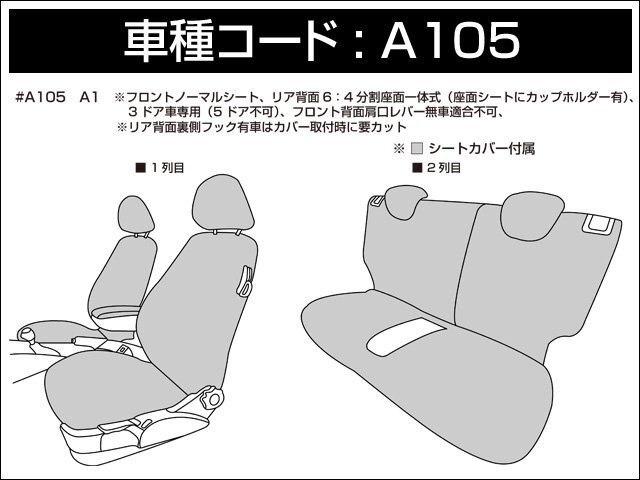 | 適合シート形状 | 3ドア車専用 フロントノーマルシート、リア背面6:4分割座面一体式(座面シートにカップホルダー有)、フロントコンソールカバー付属 、<※リア背面裏側フック有車はカバー取付時に要カット> |
