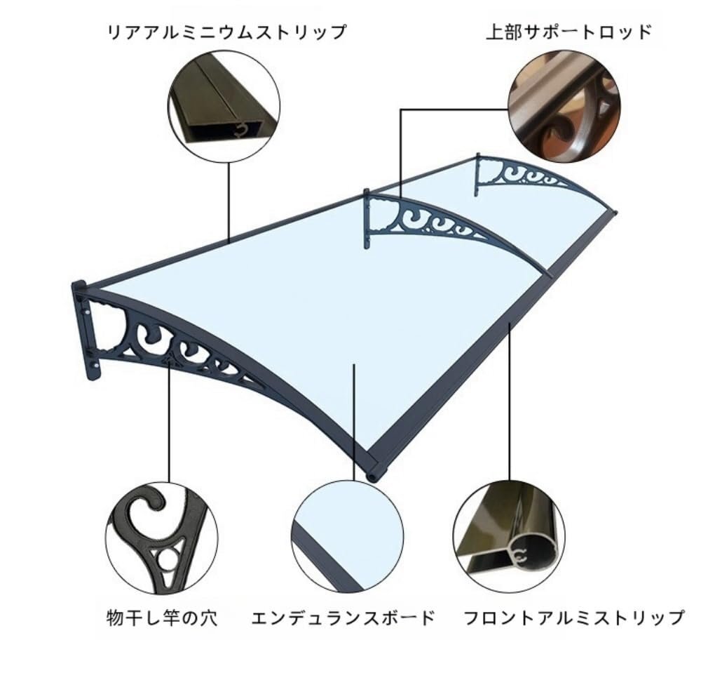 【日焼け止め、雨、雪対策カバー】丈夫な素材が夏の日差しを防ぎ、防水性に優れた使用感を提供し、家の入り口を爽やかに演出し、雨、雪、有害な紫外線からあなたと訪問者を守ります。 丈夫な素材が夏の日差しを防ぎ、防水性に優れた使用感を提供し、家の入り口を爽やかに演出し、雨、雪、有害な紫外線からあなたと訪問者を守ります。屋外用オーニングはポリカーボネート素材とアルミ合金ブラケットで作られており、耐衝撃性、耐荷重性、飛散防止性に優れています。屋外の高温の天候でも変形しません。表面にはUVコーティングが施されており、老化に強いです。アーク排水設計により、張力支持下でオーニングボードが自然に形成され、雨水がアーク表面に沿って自然に排水されます。オーニングは超静音効果があり、騒音の影響が少なく、雨によるセルフクリーニングが可能です。キャノピーカバーは、一定温度と断熱の機能を備え、美しく実用的で、中庭、バルコニー、寝室の窓、コーヒーバー、商店街、レストランなどの場所に適しています。サイズ:60*60cm , 60*80cm , 60*100cm , 60*120cm , 80*80cm , 80*100cm , 100*100cm , 120*120cm , 60*180cm , 60*200cm , 80*120cm , 80*180cm , 80*200cm , 60*300cm , 80*300cm , 100*300cmパネル材質:PCシートバー材質:アルミニウムブラケット材質:ABSプラスチックカスタマーエクスペリエンスを重視しています。ご不明な点がございましたら、時間内にお問い合わせください。喜んでサービスを提供いたします。