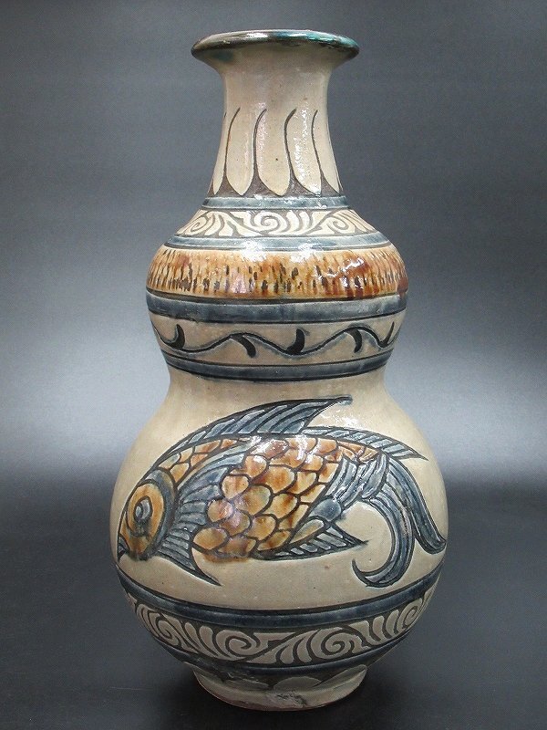 D3493 金城敏男 壺屋焼 魚紋 嘉瓶 ゆしびん 高さ36.5cm 金城次郎 長男 金城一門 壷屋 沖縄 |
