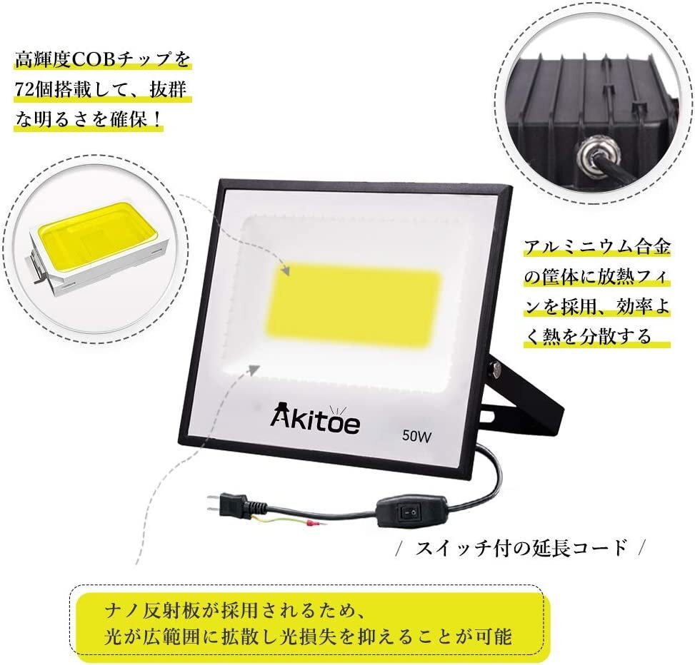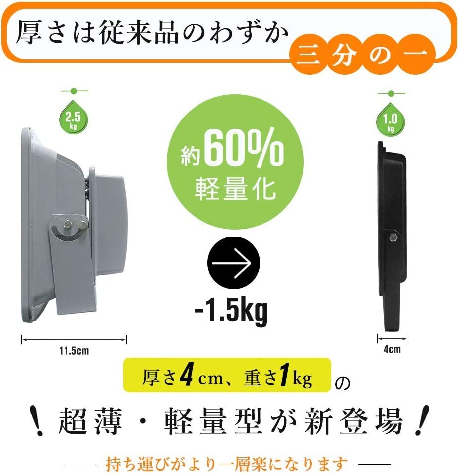 【商品詳細】 ◆軽薄化LED投光器: 1KGの軽量だから壁への負担を掛けずに壁掛けが可能、駆動内蔵設計で投光器の厚さはわずか4CMでよりスッキリと設置できます。 ◆高輝度・防眩設計: 高輝度チップを72個搭載しており、抜群な明るさを確保します。発光面が大きいので照射角度も広くなり、より広い範囲を照らすことができます。光学ガラスを採用しており、眩しさを和らげるとともに光の放射を均一にすることができます。 ◆優れた放熱性: 優れたアルミ材質を採用、熱伝道スピードは伝統投光器の2倍以上!ヒートシンクには溝があり、空気とタッチする面積が増大します。 ◆防爆耐震ガラス: レンズは強化ガラスを採用、長期間で使用でもクリアな光を照射し、耐衝撃性が高くて割れにくいです。安定・丈夫な材質で、長時間に使えます。 ◆IP66ラベルの防水性能: 密封性に優れ、IP66相当の防塵・防水性能を実現!場所を選ばず様々な用途の照明に使えます。 ◆照射角度調整可能: 回転支えを使えて、お好みに照射角度を調整できます。 ◆広い使用範囲: 軽量で持ち運びが便利です。車庫、庭、公園、街灯、玄関常夜灯、夜釣り、トンネル、工事現場、舞台照明、BBQ、ガソリンスタンド、夜間イベントなどに適用します。 【保証】 ◆当商品は12っヶ月保証となります。 ◆お届けから1週間以内にご連絡のあった不良品の保証対応の送料は当方が負担いたします。 ◆保証期間内の不良品ですが、交換のみ対応しております。往復送料はお客様負担となります。在庫がない時だけ返金しますので、ご了承ください。 |