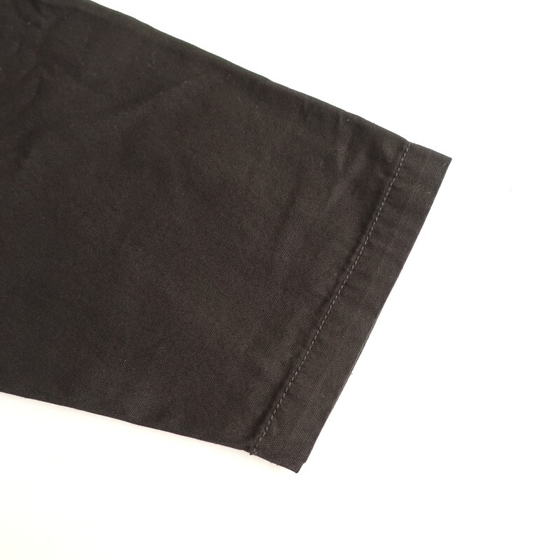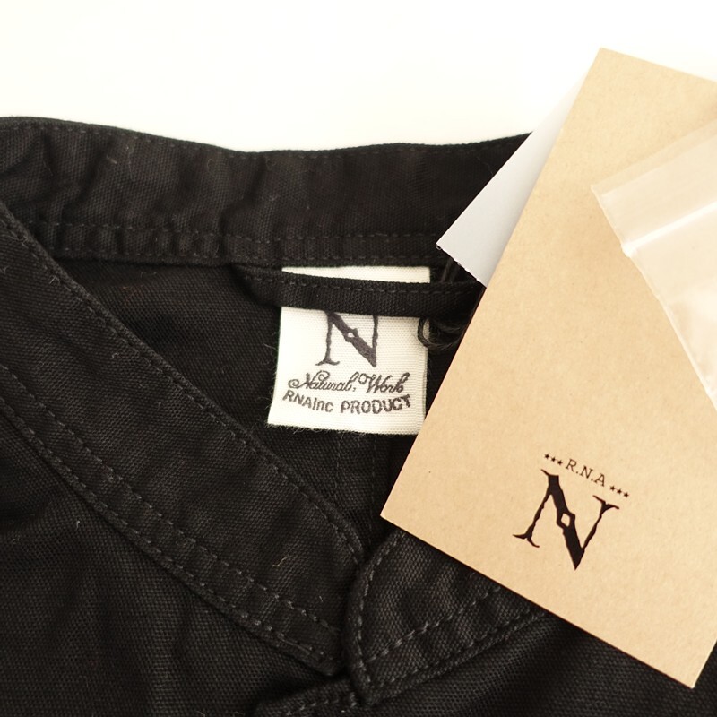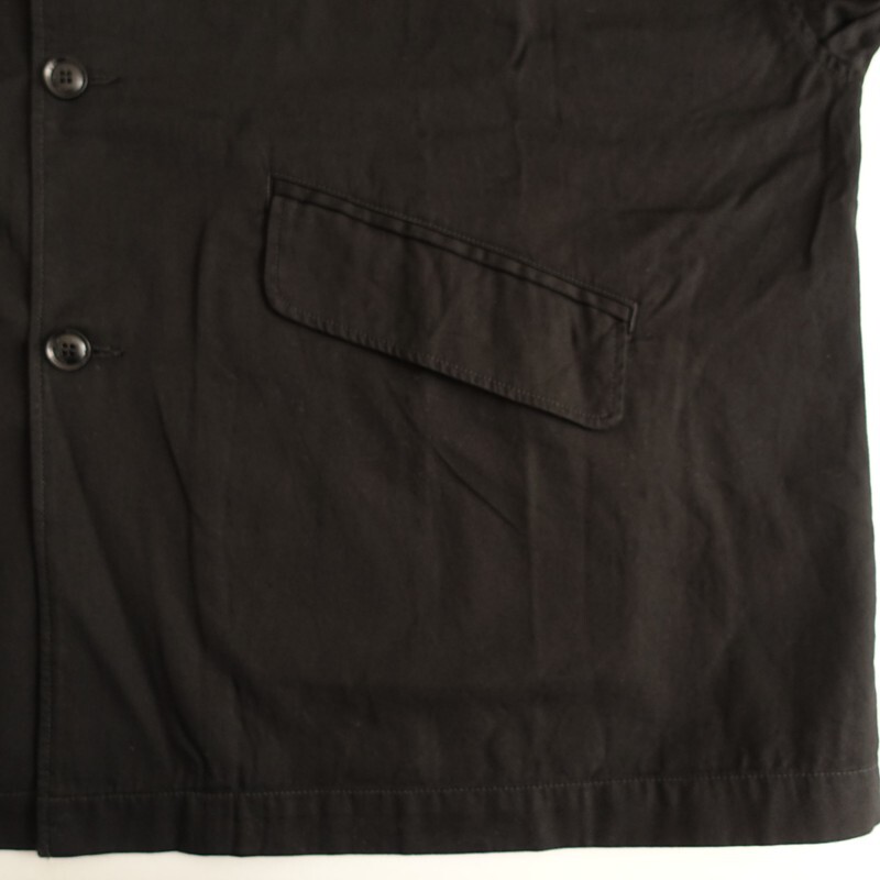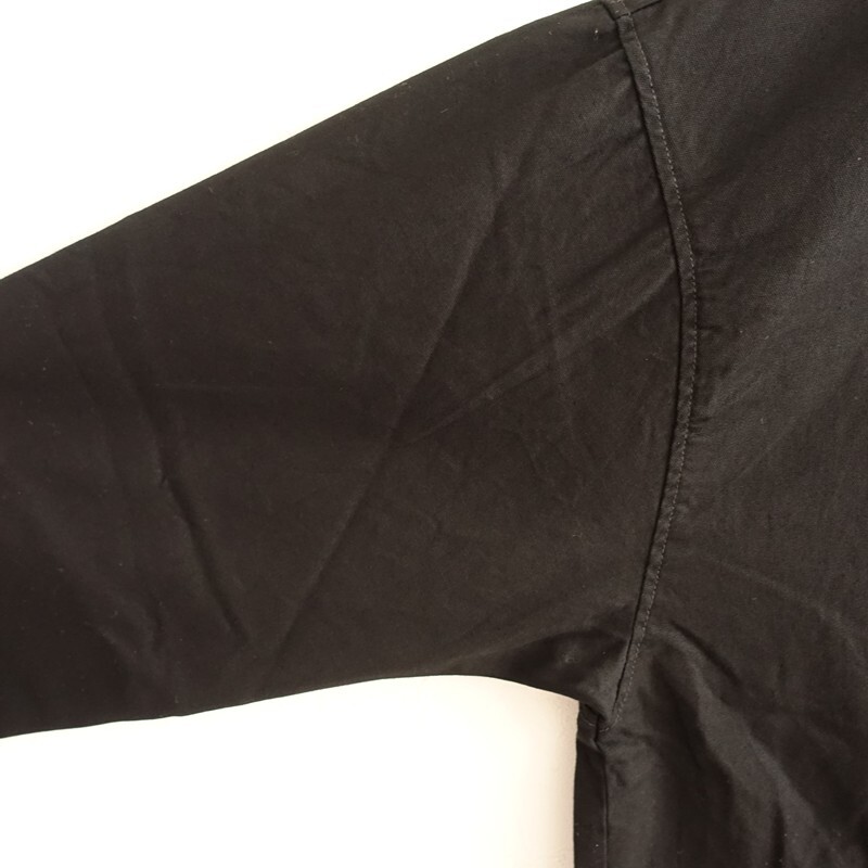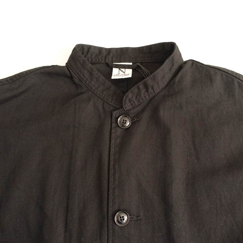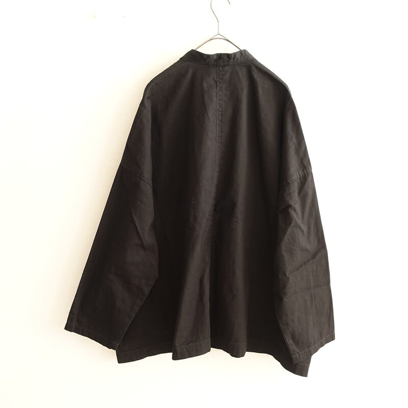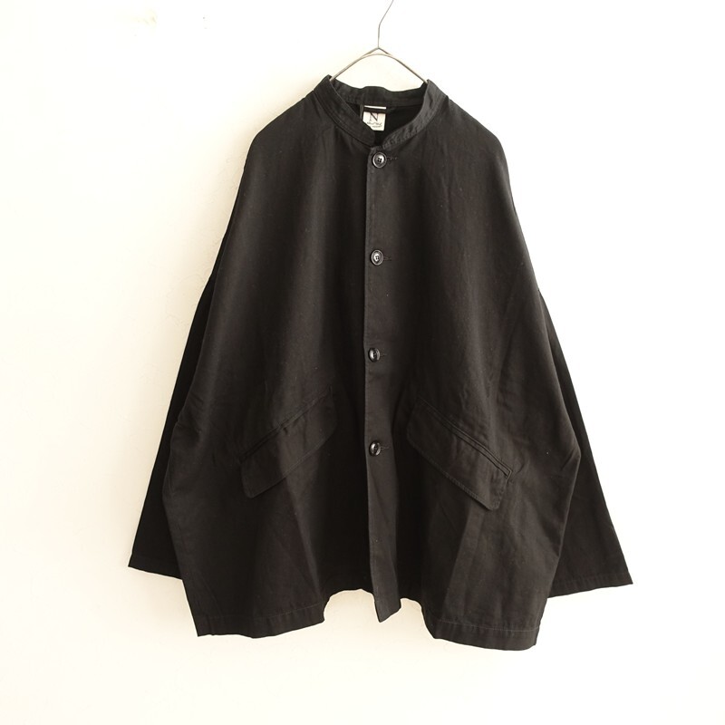 | 2025年コレクション RNA-Nのスタンドカラーロングジャケットです。カラーはブラックです。コットンオックス生地を使用。薄すぎず程よい厚みがあり、透け感はございません。小さなスタンドカラーに、ワイドな身幅、肩が落ちたドロップショルダーのオーバーサイズ仕様です。前両腰にフラップ付き玉縁ポケットがございます。定価(メーカー希望小売価格)16,500円の商品です。 |