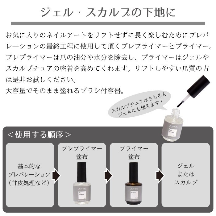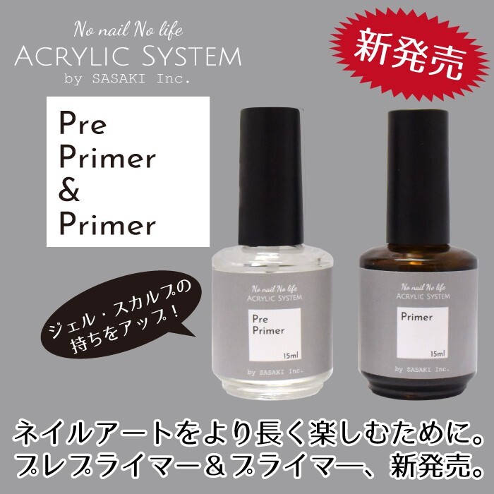 【新発売】プライマー 15ml ジェルやスカルプの定着を良くし持ちをアップさせるプレプライマー&プライマー♪スカルプチュアの必須アイテム!ノーネイルノーライフ アクリリックシステムのアクリルリキッド&パウダーと併せてご利用ください♪●容量:15ml入●原産国:アメリカ合衆国●爪化粧料※爪や皮膚に異常を感じた際はご使用を中止して下さい。※お子様の手の届かない所に保管して下さい。※パッケージ・価格等は予告なく変更になることがございます。