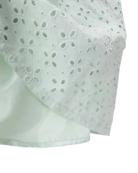 | ミントグリーンの上品なワンピース。全体にお花柄のパンチングが入っていて、女性らしい雰囲気があります。爽やかな淡いミントグリーンで、春夏スタイルにおすすめです。第6ボタンからは飾りボタンになります。 |