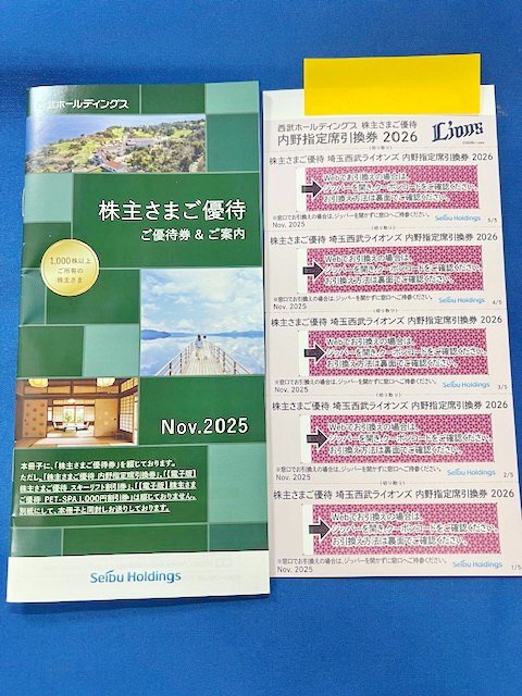 ★西武ホールデイングス株主ご優待券1冊完全未使用品(内野指定席引換券5枚及び1,000円共通割引券10枚、その他各種割引券等あります、但し「電子版PET-SPA1,000円割引券と乗車券は付属致しません」ので予めご了承ください)の出品です。出品金額は写真のような物1セット単位の金額となりますので、ご了承ください。| 出价者 | 信用 | 价格 | 时间 |
