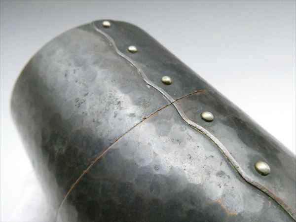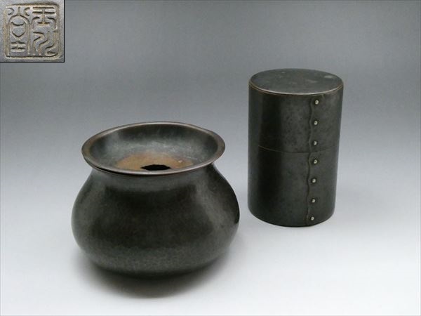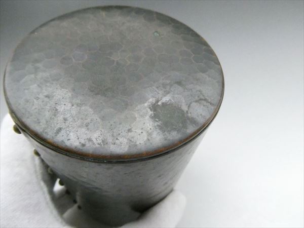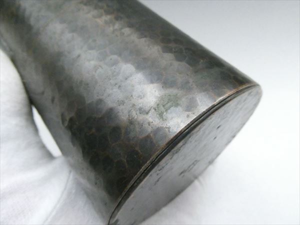 | ★商品★ ・鎚目鋲打茶筒 ・袋形鎚目建水 ※計2点の出品となります。 ★製造元★ ・玉川堂 ★寸法★ <茶筒> ・高さ (約)11.5cm ・胴径 (約)7.5cm <建水> ・高さ (約)9cm ・胴径 (約)13cm ・口径 (約)10cm ★重量★ <茶筒> ・(約)255g <建水> ・(約)296g ★材質★ ・銅製 ★状態★ ・経年による傷、汚れ、変色などが見られます。 ・茶筒の中蓋が欠損している状態となります。 ・建水に歪みの見られる箇所がございます。 ※備考※ 商品状態に関しては、あくまでも当方の見立てとなります。 程度には個人差がございますので、商品画像を良くご覧になられた上でのご入札お待ちしております。 |