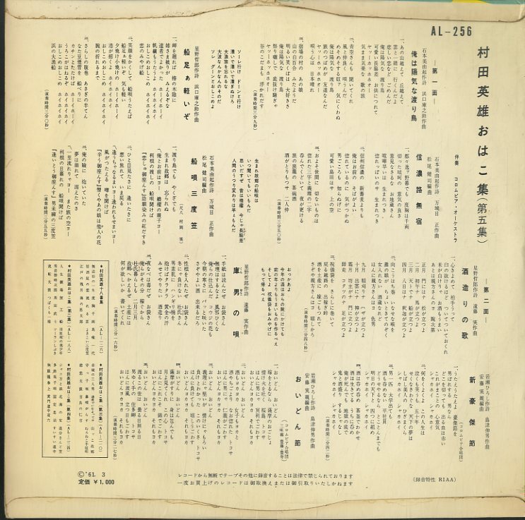 A00453574/10インチ/村田英雄「おはこ集(第五集)(1961年・AL-256)」 [浏览原始页面]