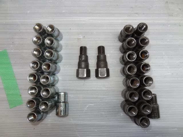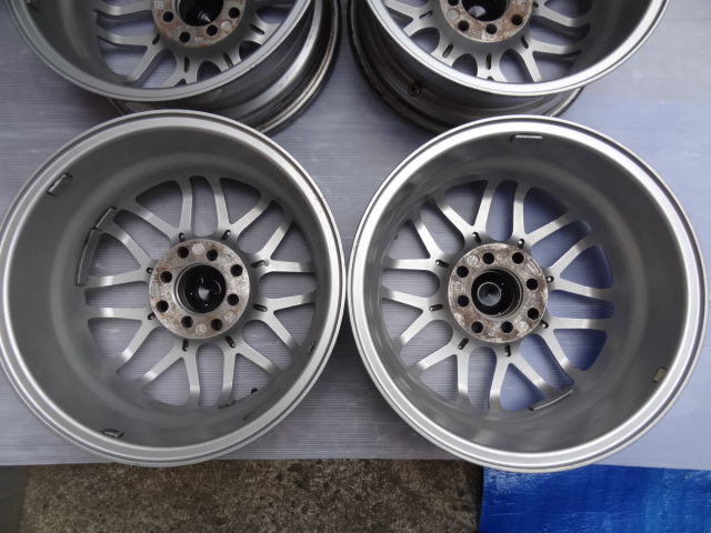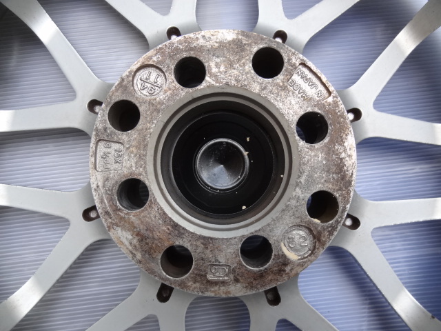 程度は古い物ですが、使用期間と使用距離が少なく保管場所が環境の良い所でずっと保管していたので当時の物としては綺麗な良い状態です。1本だけ目立つ塗装キズがありますが、それ以外は小さなキズや汚れなどはあるもののリムに目立つ様なガリキズも無くサビ等も少なくかなり綺麗な状態の物です。1本センターの割りピンのような物が欠品しております。当時初代のトヨタスプリンターカリブや日産のサニーカリフォルニアに使用していたもので専用のロックナットがトヨタ用と日産用に16個ず