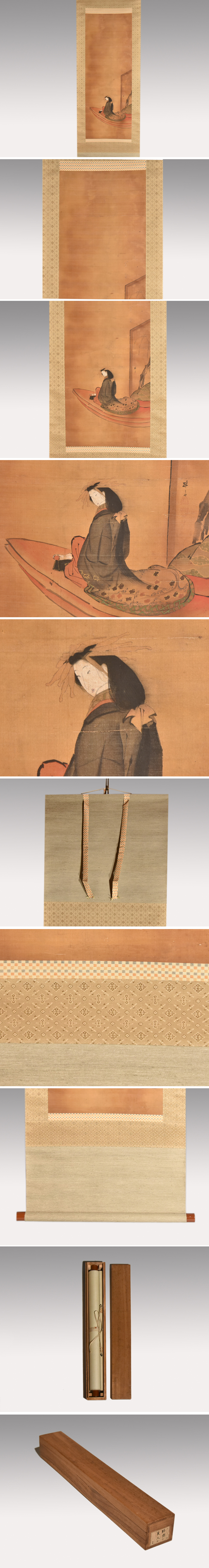 【真作】蹄斎北馬 朝妻舟です。 朝妻舟(あさづまぶね)は、滋賀県の琵琶湖畔に位置する渡船で、朝妻と大津を結ぶ重要な航路でした。 この渡船は、古代から江戸時代初期まで利用され、遊女が乗って旅人を慰める役割も果たしていました。 特に、英一蝶の絵『朝妻舟図』は、遊女が烏帽子や水干を着けた姿を描いており、江戸時代の文化や風習を反映しています この画も遊女が烏帽子や水干を着けた姿で枕が描かれ着物は千鳥が金彩入りで描かれ、屏風には枝垂れ柳が描かれ銘が「蹄斎」と書かれております。 表具は昭和に改装されており良い状態です。 ※撮影の際に生じた写り込みなどがございます。 ご理解の程よろしくお願い致します。 |