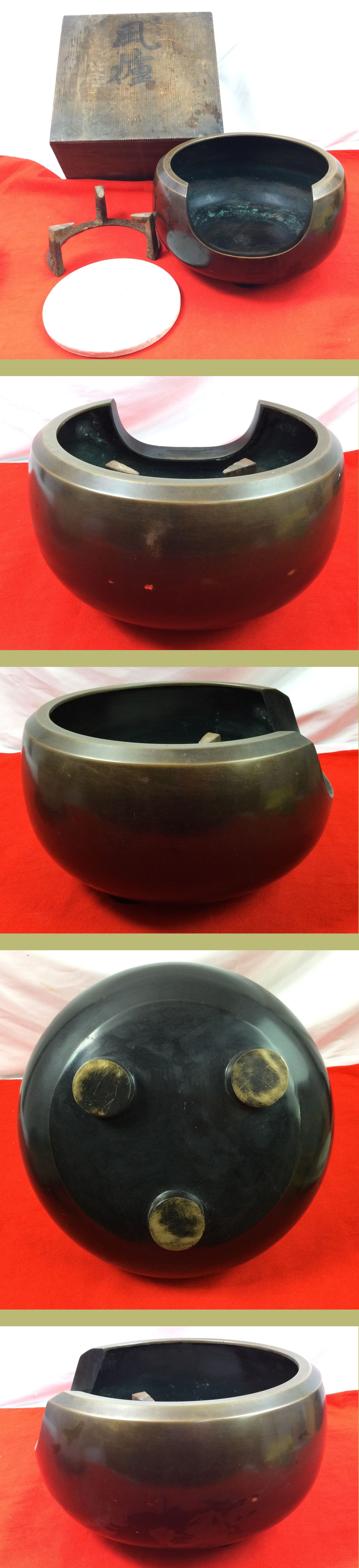閲覧ありがとうございます♪ 茶道具の銅製風炉の出品です。 丸みのある安定した造形で、落ち着いた銅肌が印象的な一品です。 時代を経た風合いがあり、茶席用としてはもちろん、鑑賞・研究・ディスプレイ用途としても趣を感じていただけます。 【サイズ(約)】 直径:約 34cm 高さ:約 21cm 重量:約 6.4kg ※素人採寸のため、多少の誤差はご容赦ください。 【状態】 本体に経年によるスレ・小キズ・くすみあり 五徳はサビあり 底板に欠け・補修痕あり 木箱は汚れ・シミあり(銘・詳細不明) ※状態は写真を優先してご判断ください。 ※現状渡しとなります。 |