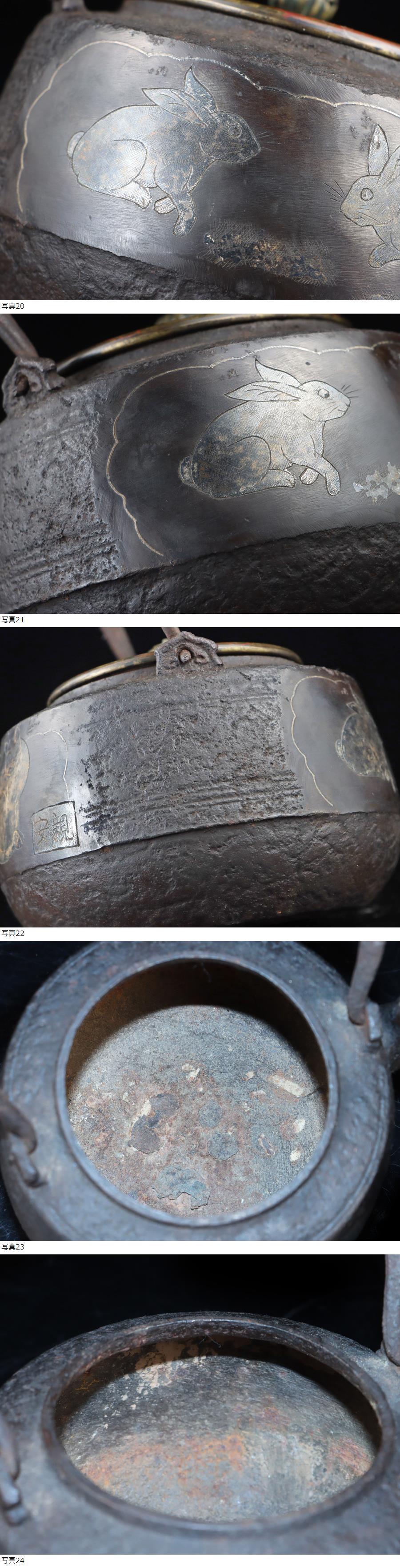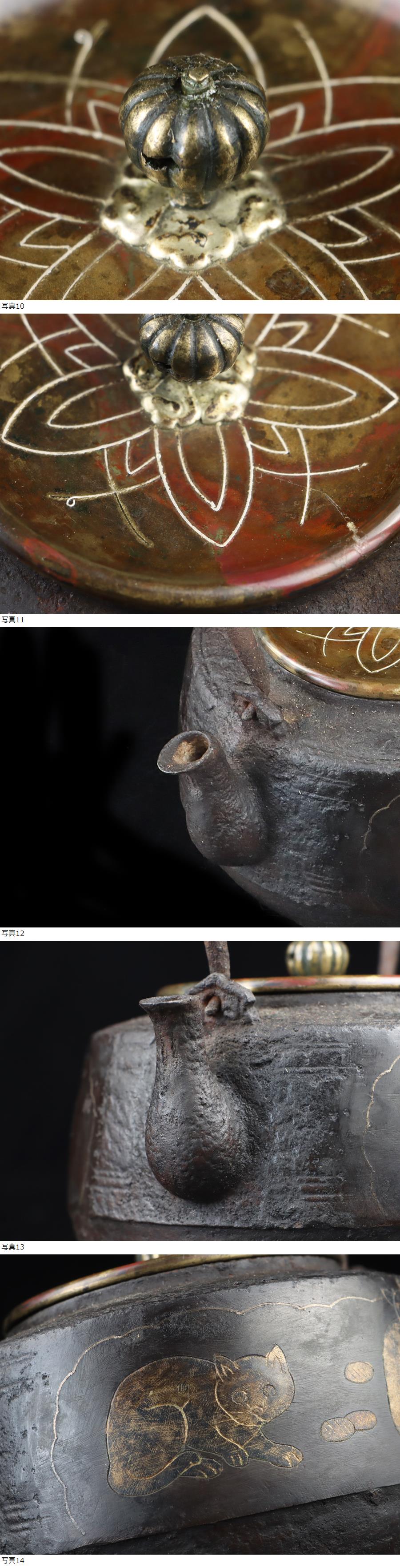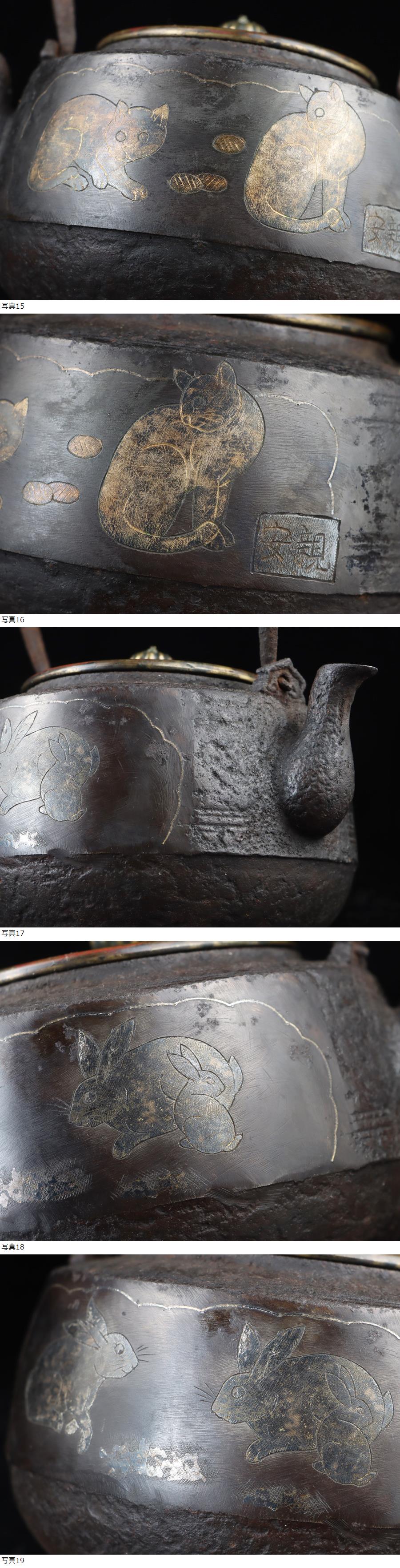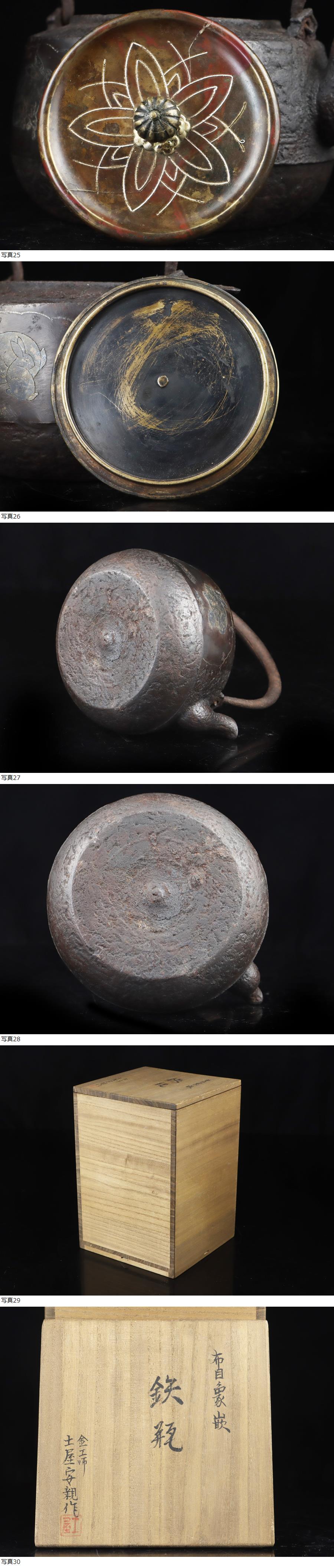 サイズ(約) 高さ 19.5㎝/横 17㎝/幅 15㎝/総重量 1.15㎏ 付属品 共箱 ※鉄瓶状態について※ 当社、鉄瓶の全て、24時間水張り確認、直火沸かし確認済みの鉄瓶でございます。 使用には全く問題ないと判断させていただいた商品のみを、出品させていただきます。 商品使用状態は、ご安心くださいませ。 ※24時間水漏れなし、確認済み ※ご使用後の水漏れに関しては責任を負えません。ご了承ください。 名家旧蔵 蔵出うぶ荷 本物保証 土屋安親(1670~1744年)江戸装剣金工師 猫兎象嵌花文蓋象嵌古作鉄瓶 江戸中期頃の作 博物館級の品! 本物保証 土屋安親 江戸時代中期の奈良派の優秀な装剣金工。土屋家の1世。通称は弥五八,晩年は東雨と号した。 め庄内金工の正阿弥珍久に学び,江戸に出て奈良辰政に学ぶ。 「奈良三作」と称された。作域がきわめて広いが,特に鋤彫を得意とした。 鉄の名人として多くの刀装具を残しておりますが、煎茶道具「鉄瓶」を金銀象嵌にて制作された幻の逸品となっております! 当時、江戸の武士達に愛好されていた刀装具の中にこのような作品が残っているのは大変貴重で希少なお品は間違いありません! 本作、江戸時代の上級武士や大名などに愛好された伝来良き御品物かと存じ、出来栄え/保存状態とも文句なしの大名品であります。 状態、時代の経過の為、象嵌ははげた部分が若干ございますが、水漏れなどなく、良品になり、時代経過の味わいが拍車をかけ良い状態をキープしております! 大事にしていただける方の入札お待ちしております! |