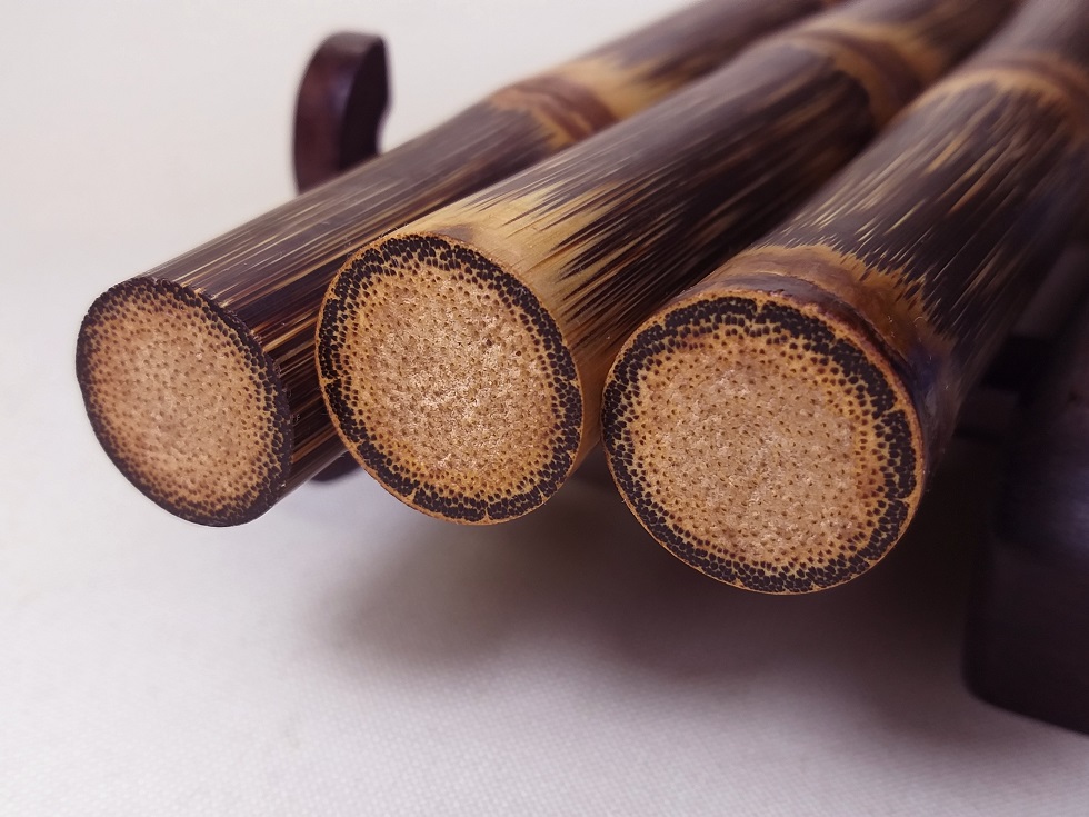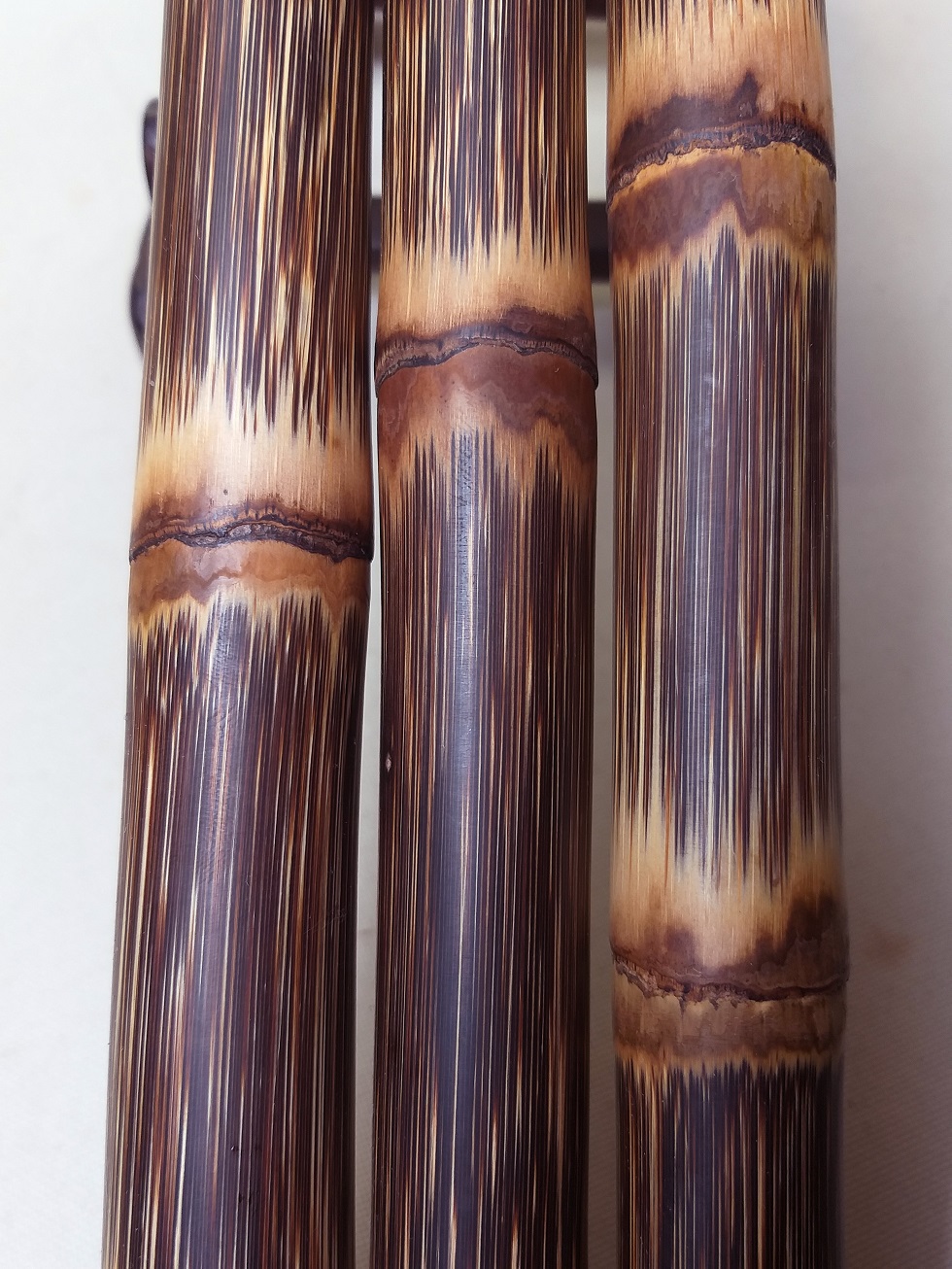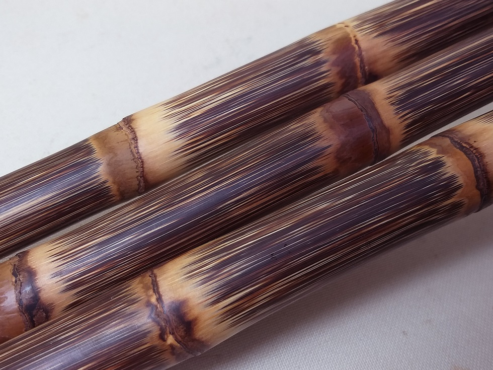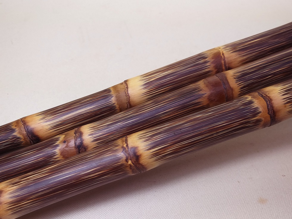 現在出品のこの3本の竹材の状態は、致命的な裂け、虫喰い、傷、欠け、変色、材質劣化等の深刻な問題はません。また、火通り(火で炙り人工的に真っ直ぐに矯正する)、石染め、蝋煮(蝋液で煮る)、湯で煮る等の人工的加工処理は、一切されていません。