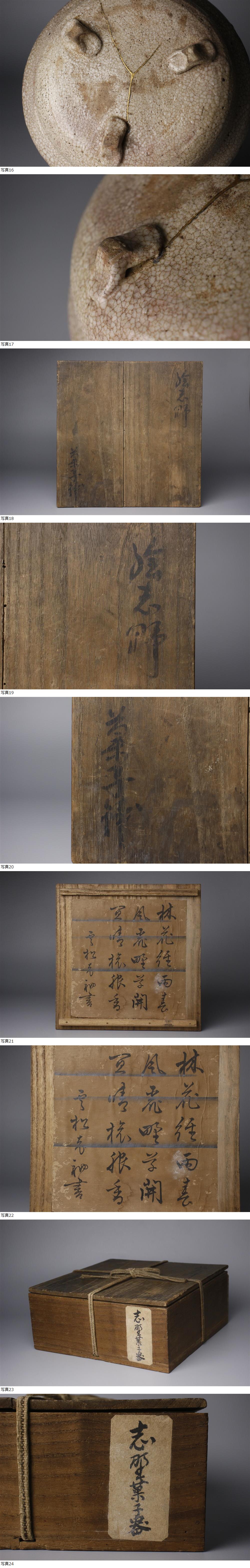 26020912 A* * * 商品詳細 * * * ここでしか出逢うことのできない唯一の美をご紹介させて頂きます。 秋の涼やかな風を感じさせる薄が描かれた古志野 菓子鉢のご紹介です。 有機的で逞しい生命力を感じさせる造形で、焼物ならではの温かみも感じられます。 経年を経た重厚な肌地には一朝一夕では出来得ない、長い年月によって育まれた素晴らしさがあります。 古陶の魅力を堪能できる逸品をこの機会に是非お手元にてご堪能下さい。 ■商品内容/鉢、箱 ※皿立は付属しません。 ■サイズ/横19.5cm×高6.5cm 箱:横22cm×高9.5cm×奥行22㎝ ■状態/経年による傷み、スレ、キズ、割れ、欠け、直し、 箱にスレ、キズ、腐食、割れ、欠け、ヤケ、シミがございます。 ※写真にてご確認、ご了承の上ご入札下さい。 * * * 支払詳細 * * * !かんたん決済 * * * 発送詳細 * * * 入金確認後3営業日以内に発送致します。 ※直接引き取りも可能です。 60~160サイズにつきましては 佐川急便、ゆうパックのどちらかで発送いたします。 ゆうパック発送の場合、弊社の発送日から追跡サービスに問合せ番号が反映されるまで 約1日ほどお時間がかかりますのでご了承下さい。 * * * 注意事項 * * * 運送中の破損があった場合は速やかに当社までご連絡下さい。 保険を利用するのに受取連絡後に運送会社による現場での破損状況確認が必要となります。 勝手に返送されますと保険の適用外となりますのでご注意ください。 * * * * * * お問い合わせ:082-236-8669 |