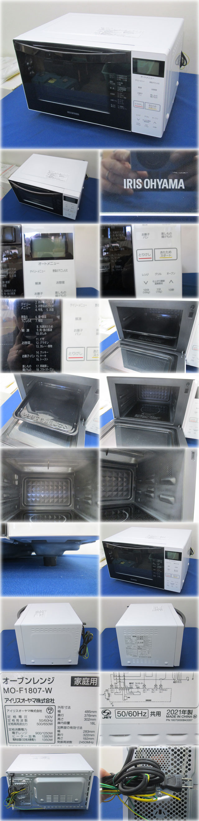 アイリスオーヤマ オーブンレンジ MO-F1807-W を出品いたします。 ■特徴■ 広々と使えるフラット庫内のオーブンレンジです。 ターンテーブルがないので ターンテーブルでは回らずに温められない 大きなお弁当もムラ無く温めることができます。 18種類のオートメニューを搭載、 お惣菜やお菓子やパンなどを簡単に作れます。 レンジ出力3段階切替(650W・500W・解凍200W相当)で 用途に合わせて使い分け可能です。 周波数50Hz(東日本)・ 60Hz(西日本)共用のヘルツフリーなので、 どちらの地域でもお使いいただけます。 ■仕様■