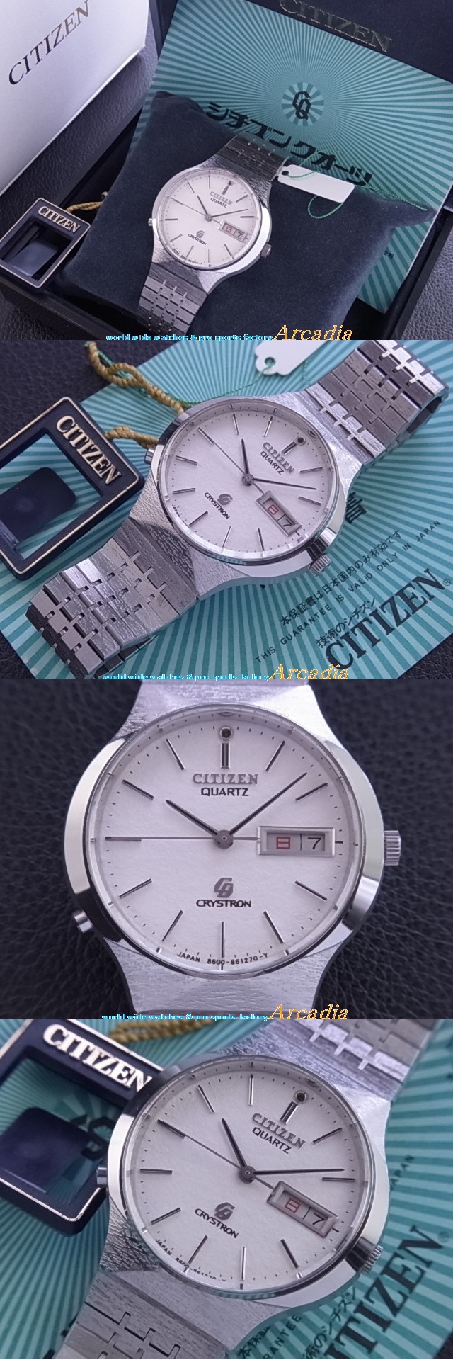 case-●SS(ステンレススチール)槌打ち仕上/サファイヤガラス風防側 純正SS-SS槌打ち仕上無垢厚ベルト 純正SS-アジャスター付きバックル/CITIZEN CQマーク付(CITIZEN WATCH CO JAPAN ALL SS内刻印) 約85g(本体/ベルト/バックル含み) クオーツ デッドストック品の為非防水 |