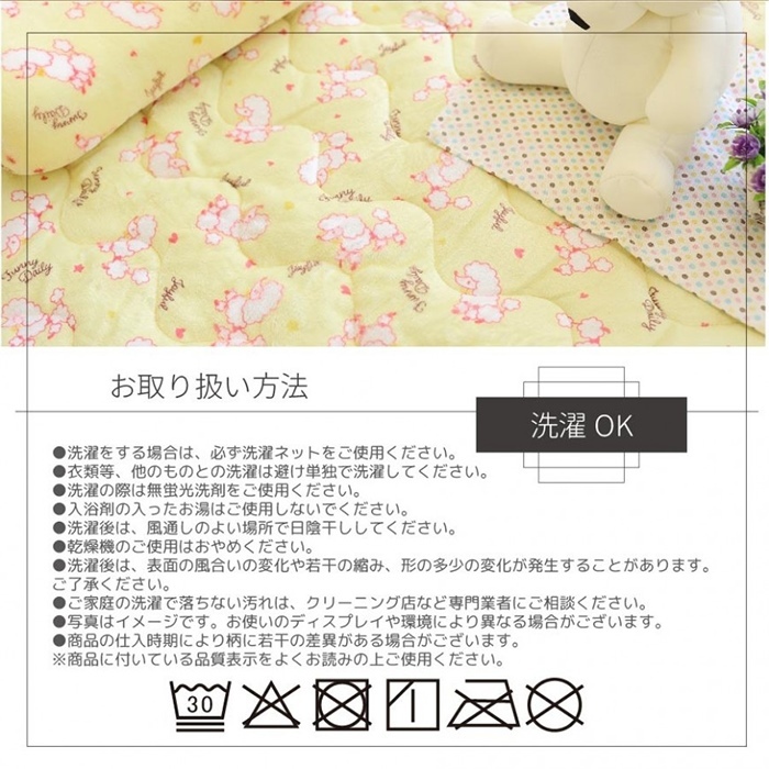 | [お取り扱い方法] ・洗濯をする場合は、必ず洗濯ネットをご使用ください。 ・衣類等、他の物との洗濯は避け単独で洗濯してください。 ・洗濯の際は無蛍光洗剤をご使用ください。 ・入浴剤の入ったお湯はご使用しないでください。 ・洗濯後は、風通しのよい場所で日陰干ししてください。 ・乾燥機のご使用はおやめください。 ・洗濯後は、表面の風合いの変化やじゃ間の縮み、形の多少の変化が発生することがあります。ご了承ください。 ・ご家庭の洗濯で落ちない汚れは、クリーニング店など専門業者にご相談ください。 ・写真はイメージです。お使いのディスプレイや環境により異なる場合がございます。 ・商品の仕入れ時期により柄に若干の差異がある場合がございます。 ※商品についている品質表示をよくお読みの上ご使用ください。 |