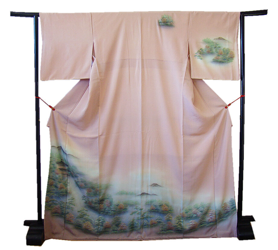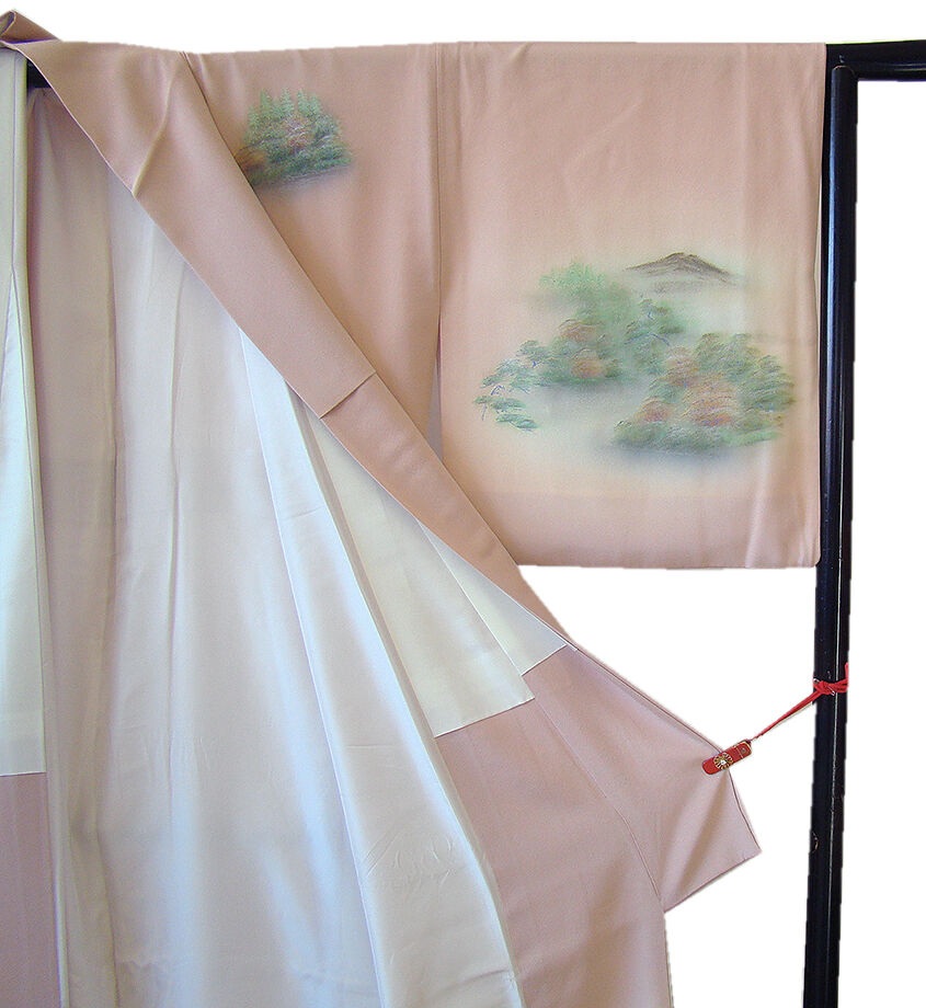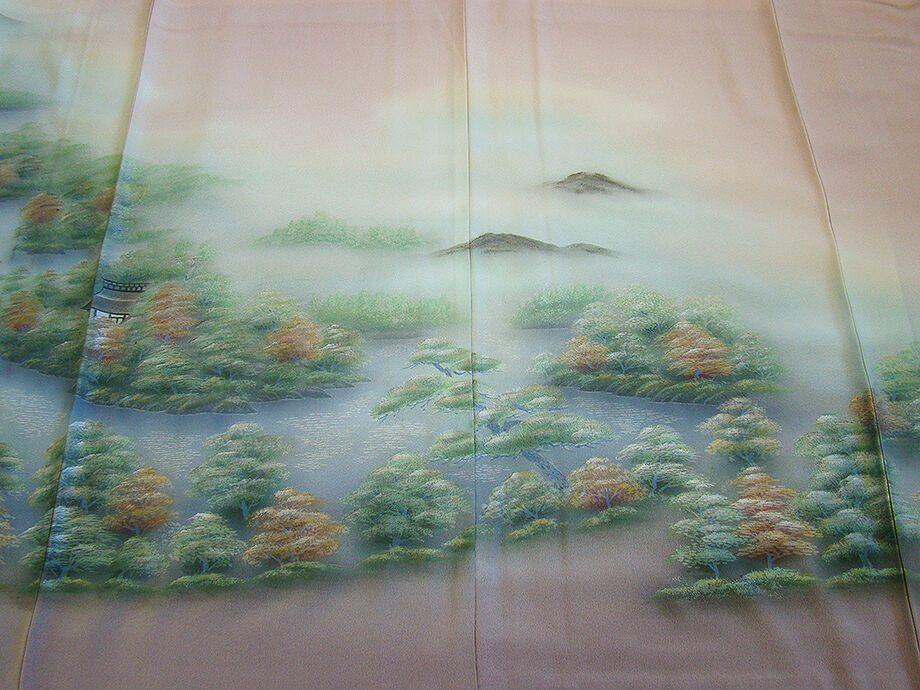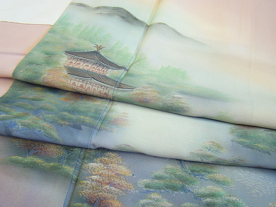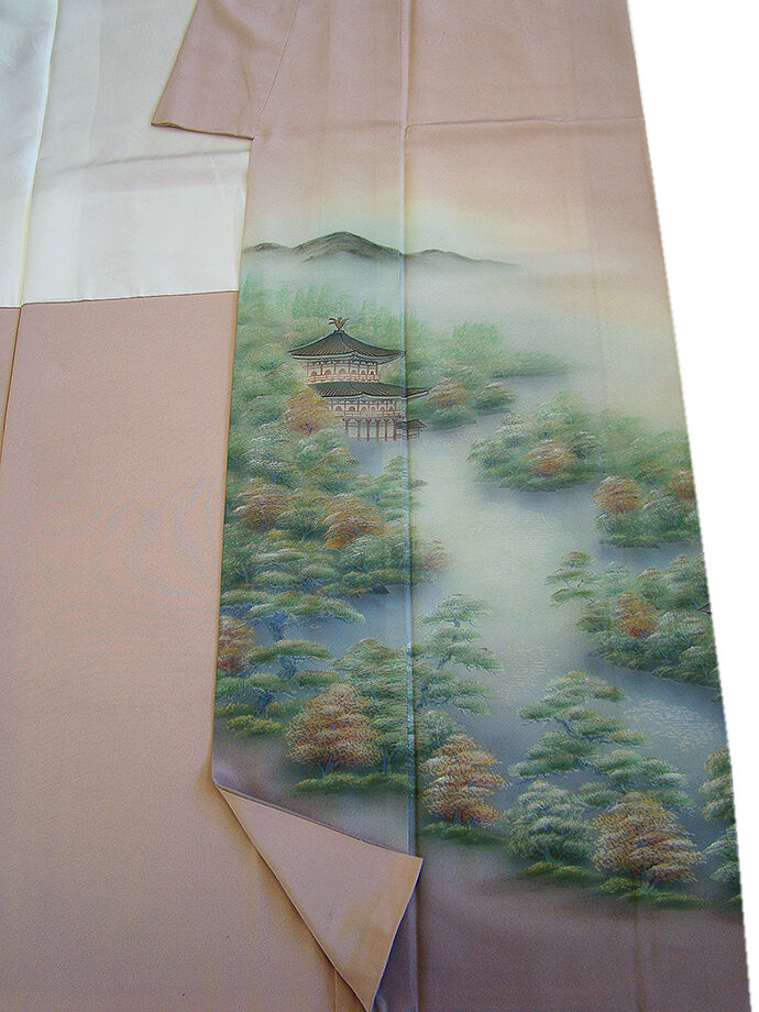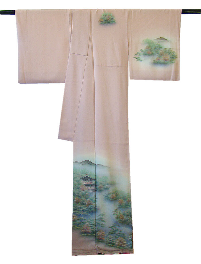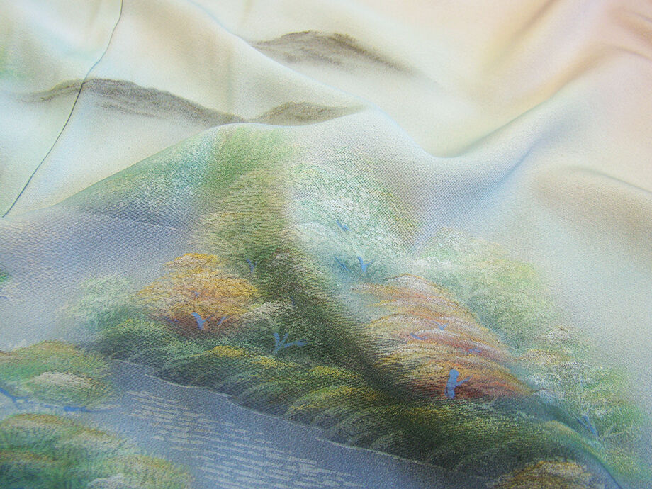 | 商品説明 | こちらのお品は「袷」ですので10月から5月までお召頂ければと思います。 しなやかで滑らかな手触りの着心地良い重めの極上ちりめん地の生地、 灰桜色地に裾にかけ葡萄鼠、灰青色等のぼかし染に 木々や遠山、寺院等の風景柄の染柄に金銀彩加工仕立て、 八掛は共布に柄入り(正絹)、幅広い年代の方にお召頂けるでしょう。 |