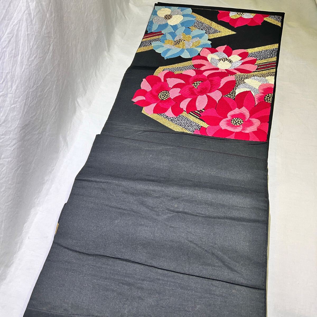 ★美品★ 袋帯 六通 正絹 金銀糸 黒地 ブラック 刺繍 花柄 おしゃれ 振袖 色留袖 訪問着 付け下げ 着物 袷 鼓 レディース 婦人 (01177並