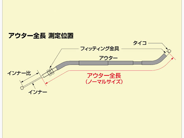 | アウター長 1100mm ※ワイヤーオイルを定期的に注入してください 適合車種(備考) YB-1FOUR(00-07 5JE)((150mmロング)) ※取り寄せ品 |