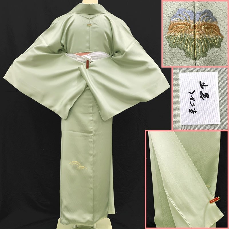 | 〇京都工芸染織宮下 付下げ 刺繍 浦島太郎 洒落紋 金駒刺繍 たとう紙付き〇美品 (No.ed) 京都工芸染織、宮下取扱い。網代崩し文様の地紋が浮かび上がるややくすんだ淡い緑色の地に、浦島太郎と竜宮城の刺繍が施された付下げです。「蔦」の洒落紋がございます。京ごふく宮下のタグ、画像のたとう紙がございます。 (画像の帯412mn6や小物は参考商品で、本品には含まれません) 衿山と袖口に薄っすら使用汚れがございますが、着用の際は隠れる部分です。 【表地素材】正絹 【色】ややくすんだ淡い緑 *モニターによって色味は実際と異なる場合がございます。 【サイズ】裄:67.5cm、丈(肩から):167cm、袖幅:34cm、袖丈:49cm、前幅:24.5cm、後幅:28.5cm、裄の縫込み 身頃側:1cm、お袖側:1cm、内揚げ幅:3.5cm *素人採寸のため、多少の誤差はご容赦ください。 上質な逸品ですので、いかがでしょうか?よいお品物でお勧めです^^ | |
