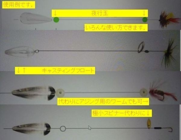 | 商品説明 | キャスティング用フロート、3種6個セットです。 アジング、メバリング、ケタバス、トラウトなどあらゆる釣りでお使いいただけます。 (詳しい使い方はキャスティングフライセットの出品のほうのイラストや説明文をご覧ください) 5cm 3g ミノー型 2個 7cm 10g ポッパー型 2個 11cm 11.73g ミノー型 2個 軽いフライやジグヘッドリグ、スピナー、毛鉤、等を遠投したい場合に フライをスピニングリールで投げたい時にもお使いいただけます。 トレブルフックをつけていただいて、そのまま普通にルアーとしてもお使いいただけます。 |