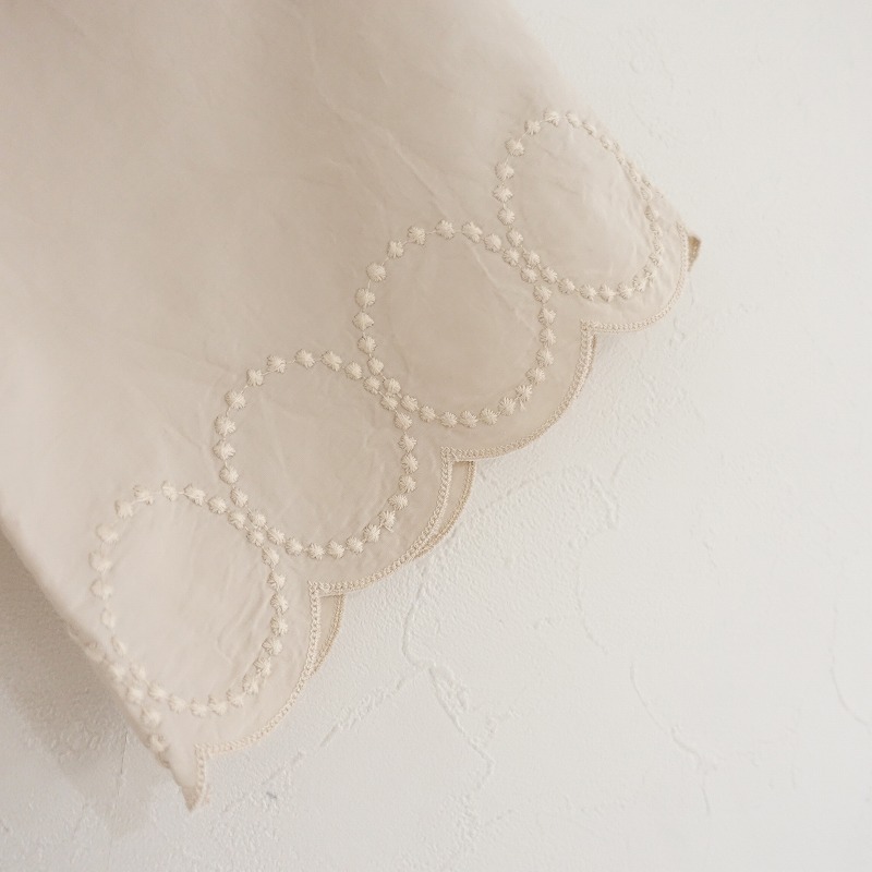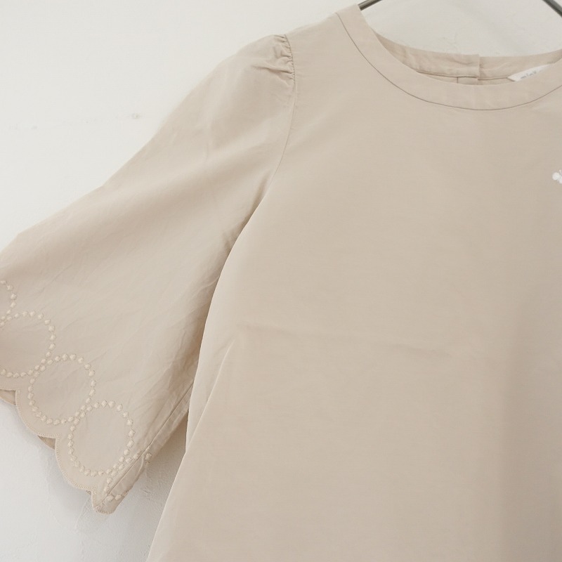 | 2025年春夏コレクション mina perhonenのtambourine 背開き刺しゅうブラウスです。カラー(ブランド表記カラー)はライトベージュで、布帛地です。袖付け部にギャザー入りで、袖口周りには刺しゅうが施されており、袖口布端はスカラップ仕様です。後ろの全開ボタンで着脱でき、左胸に蝶刺しゅう入りです。定価(メーカー希望小売価格)41,800円の商品です。 |
