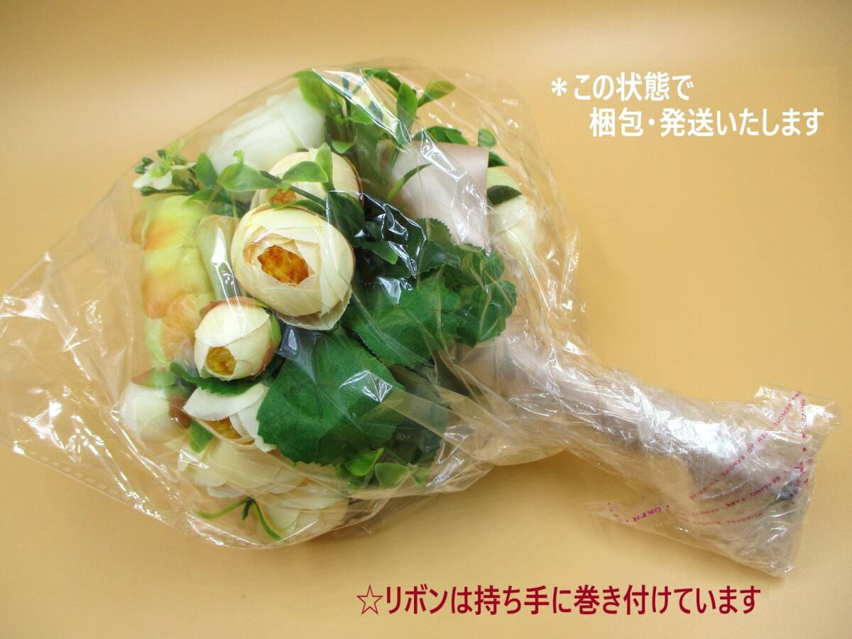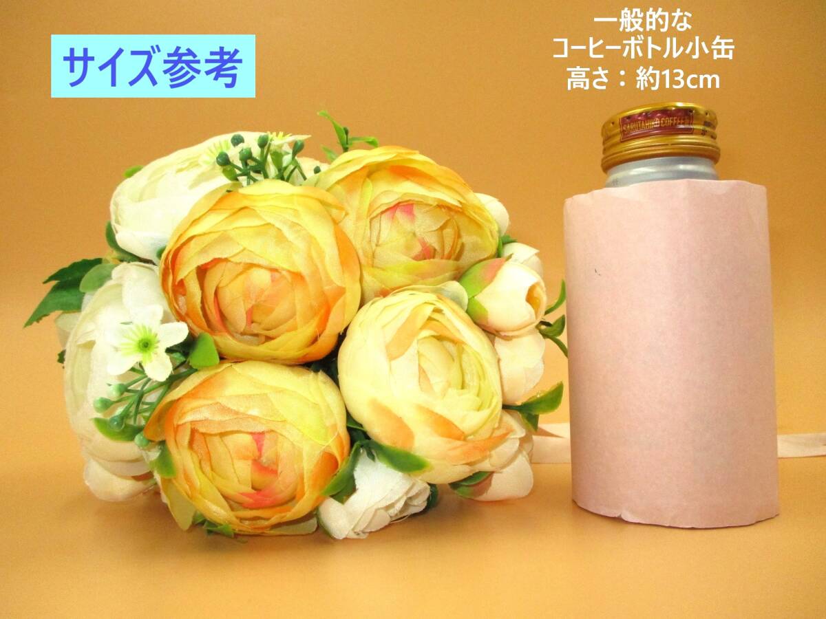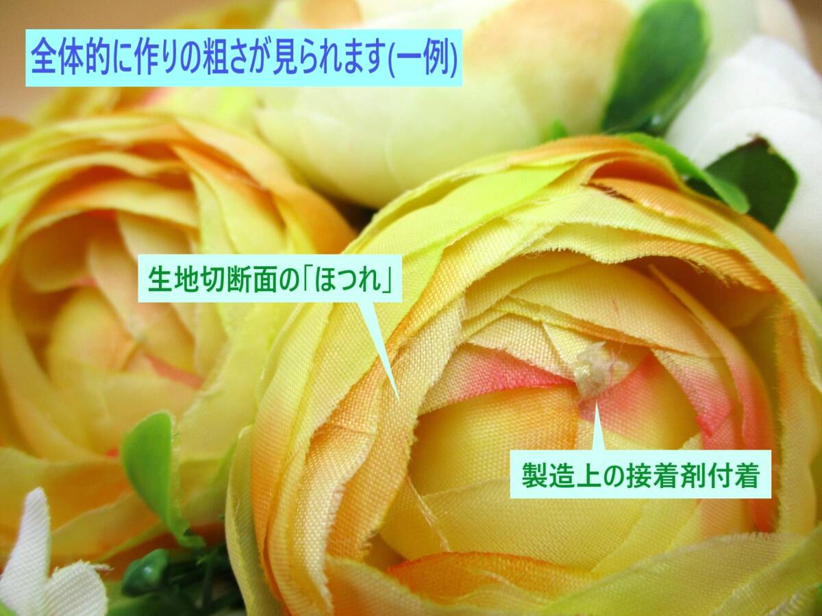 | 「訳あり」扱いの 未使用品です。 専用のパッケージ等の外装は ありません。 玄関やリビング等に 気軽に飾れる 造花の 小ぶりな花束です。 お色は 明るくかわいい イエロー系です。 海外製につき 全体的に 作りの粗さが見られます。 また 倉庫での長期保存品のため 経年による色あせや色のくすみ・ 埃の付着がある場合があります。 このため「訳あり」として出品いたします。 以下の商品説明をよくご覧になってから、 ご検討をお願い致します。 神経質な方、完品をご希望の方は、 御入札をご遠慮ください。 【商品内容】 室内向け 造花 インテリアフラワー ブーケ(花束) ・カラー:イエロー系 ・サイズ(外寸・おおよそのサイズ): 全長/約 25cm (「全長」のうち 茎の部分は約14cm) 造花部分 約 18cm×15cm *画像1の状態にて 造花の広がり方により多少の差異があります 飾りリボンの長さ 結び目から 約 33cm ・重量: 150g程度 ・その他: 海外製 タグなどがありませんので メーカー・造花素材などの詳細は不明です *セット内容・状態は、画像にてご確認下さい *実際の商品の色味とは異なる場合があります *サイズ対比として、 一般的なコーヒーボトル小缶を置いています 参考にどうぞ(画像7・8) 【状態等】 ・未使用品です。 ・専用のパッケージ等の外装は、ありません。 ・長期保存品につき、 経年による色あせや色のくすみ、 埃の付着がある場合があります。 美品をご希望の方はご遠慮ください。 ・全体的に、作りに粗さが見られます。 (素材切断面の処理・ボンドのはみだし等) 画像を参考にご検討ください。 (参考:画像9) 【補足】 保管中、及び配送中等に、 造花の形が崩れる可能性があります。 お手元に届きました際には、お手数ですが、 落札者様の方で形を整えていただいてから、 ご使用いただきますようお願いいたします。 (発送状態:画像10) 以上の点より「訳あり」として出品いたします。 ご承知をいただける方のみ、 ノークレーム・ノーリターンにて ご検討下さい。 | ||