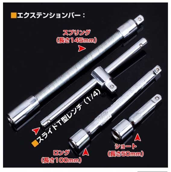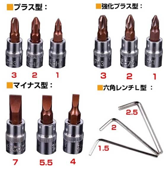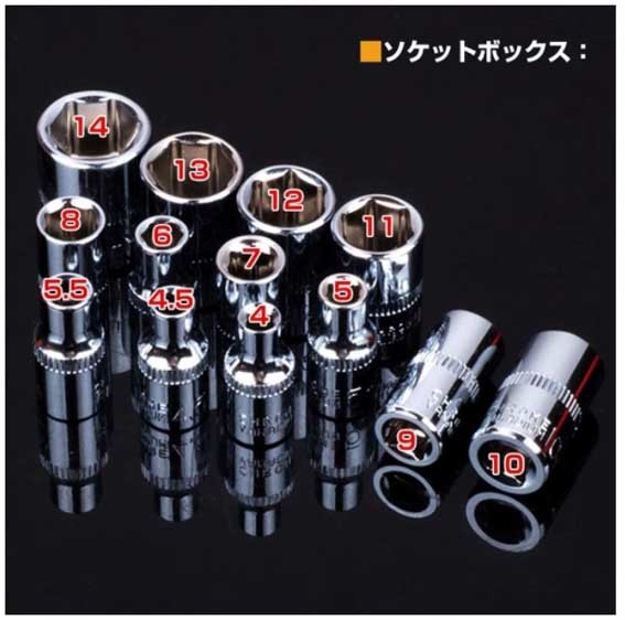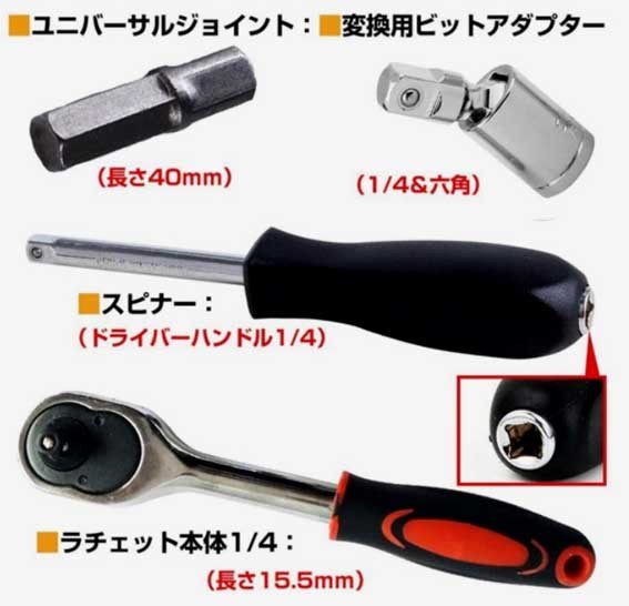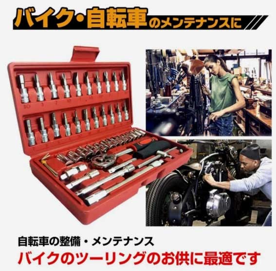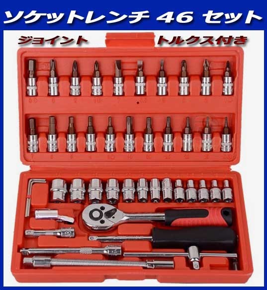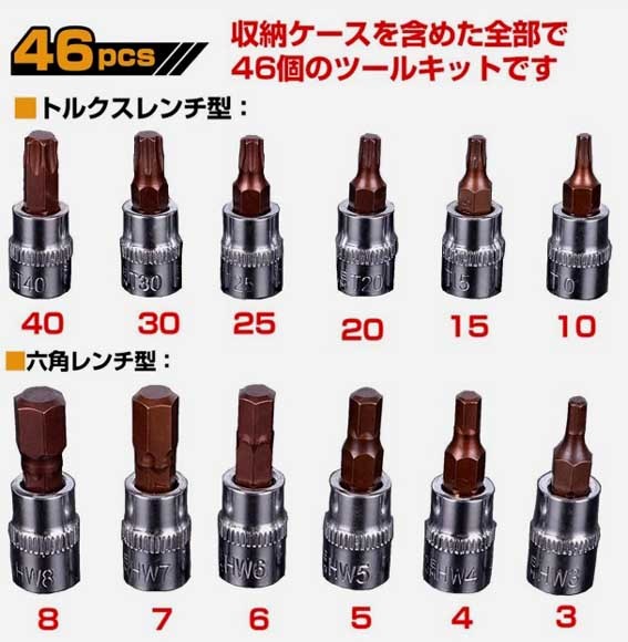 | 商品紹介 | ※プラケース入り 豪華46点セット。 ◎・日曜大工など◎DIY スパナ ドライバー ソケットレンチ トルクス ヘックス ◎ソケットラチェットレンチアダプターの豪華46点セットです ◎ホームセンターなどで販売されております工具セットはラチェット・ ソケットのみのセットが多いですがこちらの工具セットはトルクスなどの 工具もセットになっておりますのでDIY時に活躍すること間違いなしです! ◎差込角別にソケットの色分けをしており、差込角ごとの識別が容易です ※ラチェットハンドルで、細やかな動きが可能で狭い場所での作業は抜群です ※送料;全国共通600円(〒 定形外便 又はレターパック他;配送方法の指定不可)。※在庫。 ※六角ボルト・ナットやネジの締付け、緩め作業に可能です。 ◎面接触加工のソケットはボルト・ナットの角に優しい仕上げになっています。 ◎簡単な補修や緊急時の備えとしてツールをお勧めます! ※他の商品とあわせる混載同梱包はできません。 (宅配便希望の場合は送料問い合わせ下さい)代引き不可。領収書は個人のため不可。 ※他にも出品してますので、良かったらご覧ください。※休業日は自己紹介欄に記載してます。 全商品のページTOOLS1a |