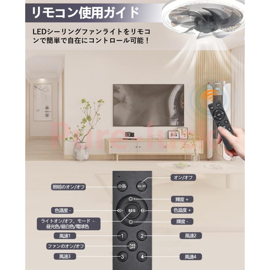 ・風量調節:ワンタッチ4段階 ・リモコンメモリー:リモコンの電源ボタンでOFFにした最後の状態で点灯、運転