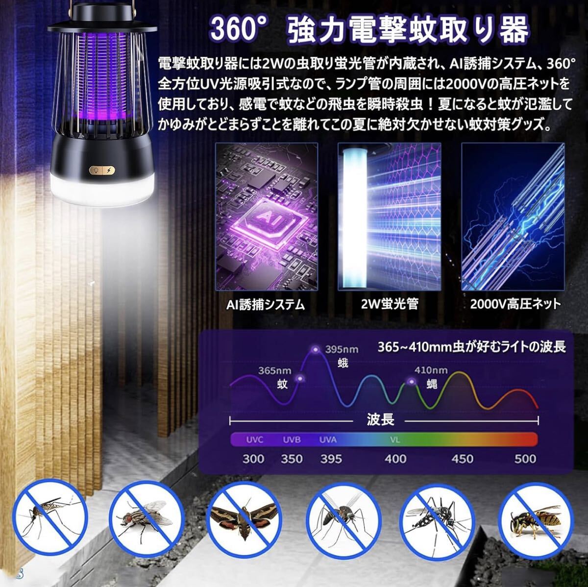 【2025業界新開発3in1&超強い電撃殺虫器】Smalifeは独自開発によって、史上最強の蚊取りライトを発表いたしました。電気ショックで蚊を駆除、炎のゆらぎで雰囲気を演出、明るいLEDで周囲を照らす多機能ライト。キャンプや庭先で活躍!この多機能誘虫灯は最新技術のマルチバンド周波数変換ランプビーズを用いて蚊を誘引し、害虫の好きな光が集まる習性を利用して、紫外線ランプで導き、害虫が好む光(波長360〜400nm)、この物理光波は365nm(蚊誘引)、395nm(蛾誘引)、410nm(コバエ誘引)であり、市販上の365nmの電撃殺虫機より誘引できる害虫の種類は多くなる。電撃蚊取り器には2Wの虫取り蛍光管が内蔵され、ランプ管の周囲には2000Vの高圧ネットを使用しており、AI誘捕システム、360°全方位UV光源吸引式なので、物理的に蚊を殺します。夏になると蚊が氾濫してかゆみがとどまらずことを離れてこの夏に絶対欠かせない蚊対策グッズ。| 出价者 | 信用 | 价格 | 时间 |