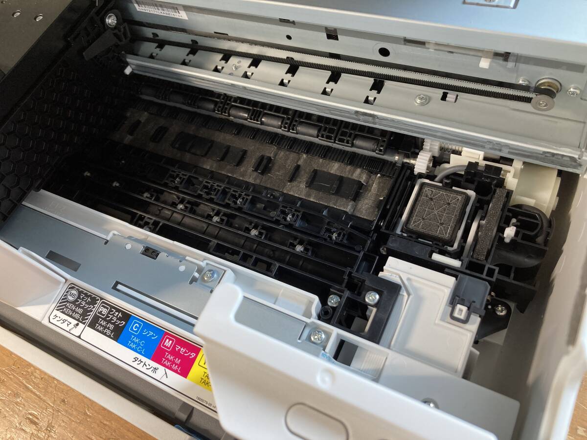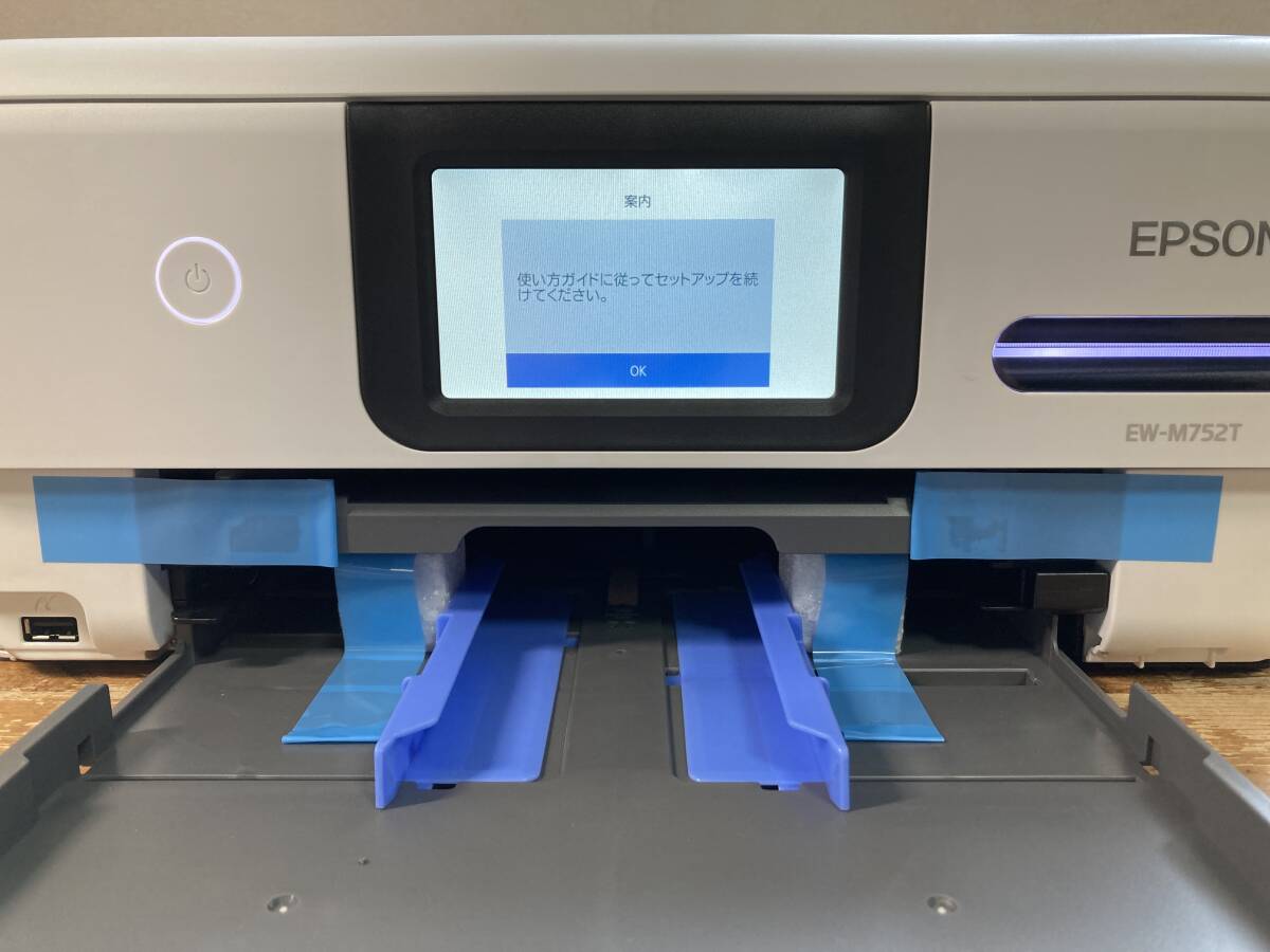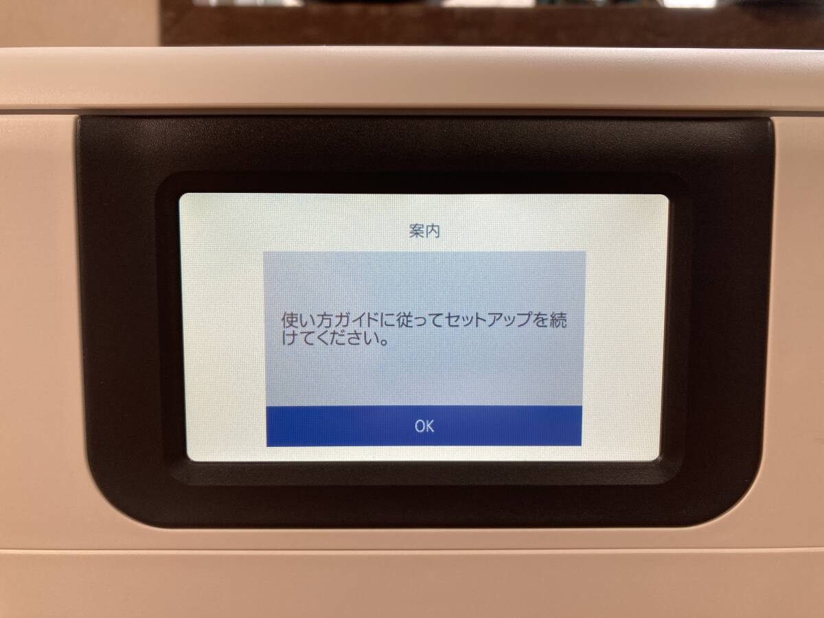 電源投入後に画像にあるメッセージが出ました。インクを入れた形跡もありません。下部トレーには緩衝材があります。