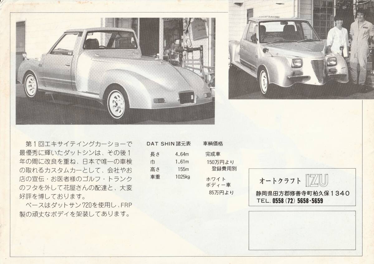 アクセスいただきありがとうございます。この品はダットシンのカタログです。両面の1枚物です。面白いカスタムカーです。あまり出ない品です。紙物コレクターの方にお薦めです。経年によるシミ・切れがあるので、写真を参考にして下さい。ネコポス送料込みでの出品です。中古品とご理解の上でNC・NRでお願いします。出来るだけ迅速な対応を心掛けますが、仕事上連絡が遅くなる場合もあるのでご了承下さい。