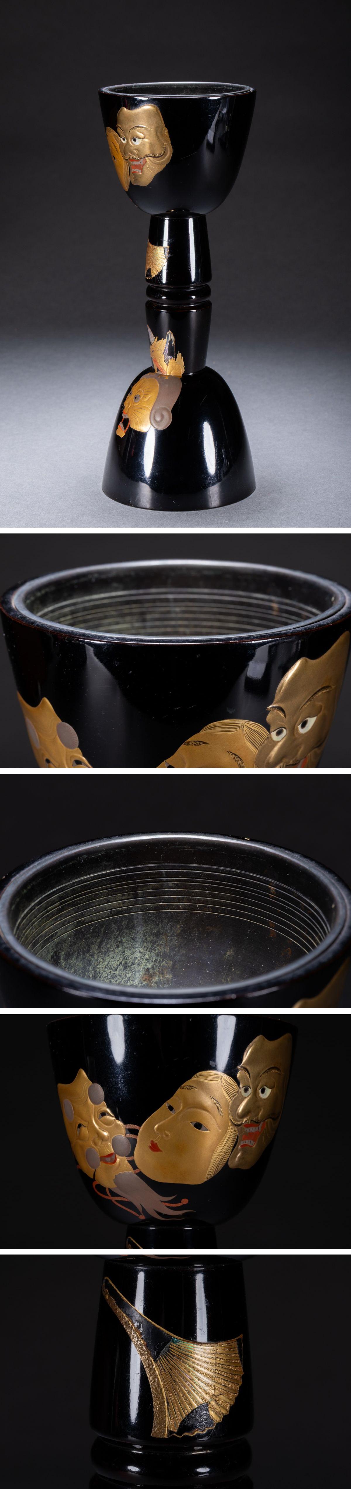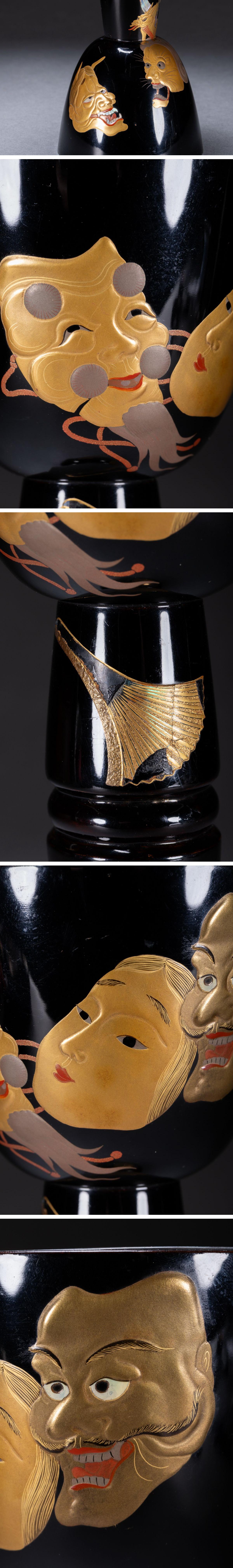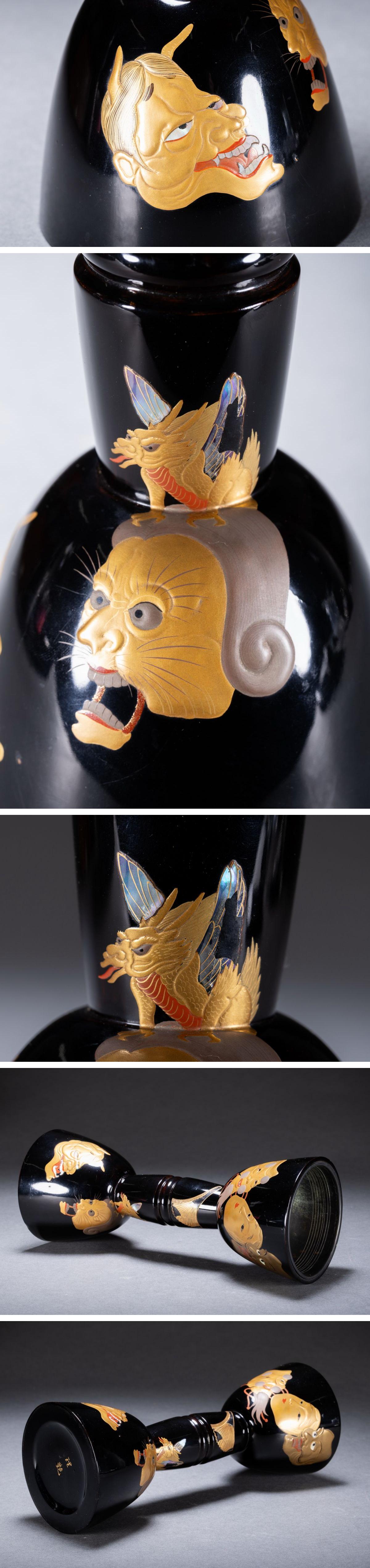 【清】時代和楽器 鉋目彫 黒漆塗 能面金蒔絵小鼓 一式 高26.5cm【理艶在銘】・蒔絵鼓胴 共箱 時代和楽器7L6-670S4