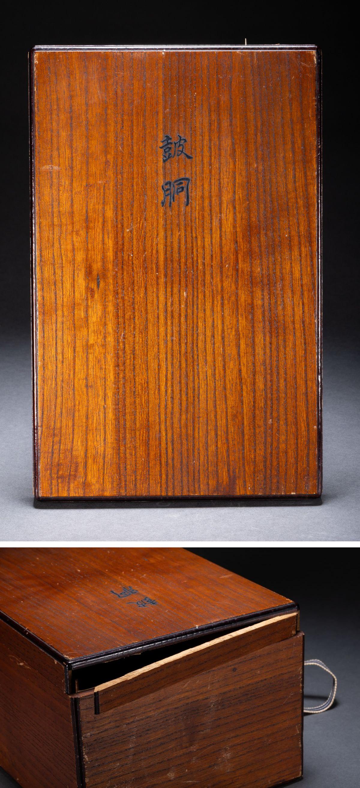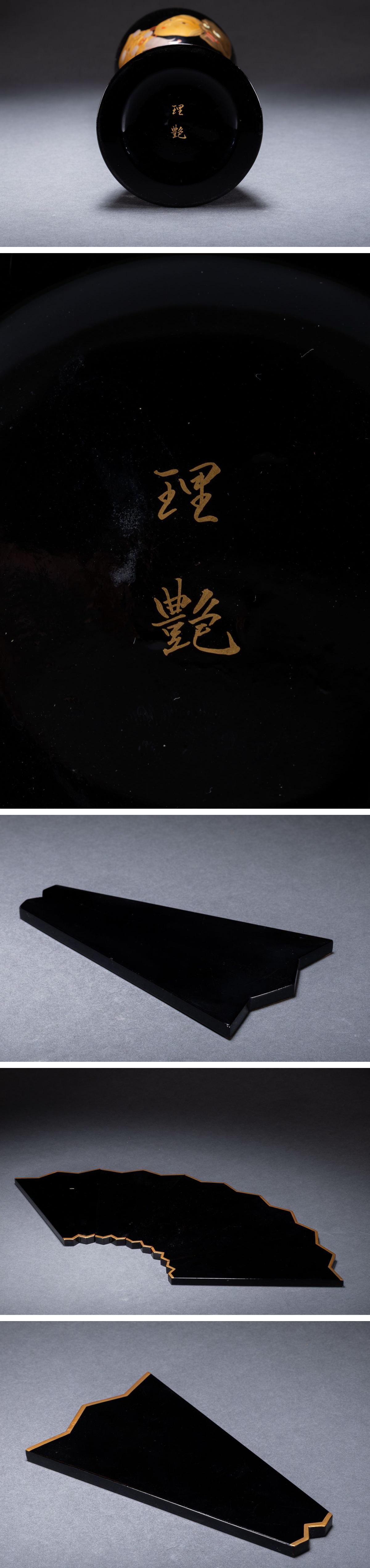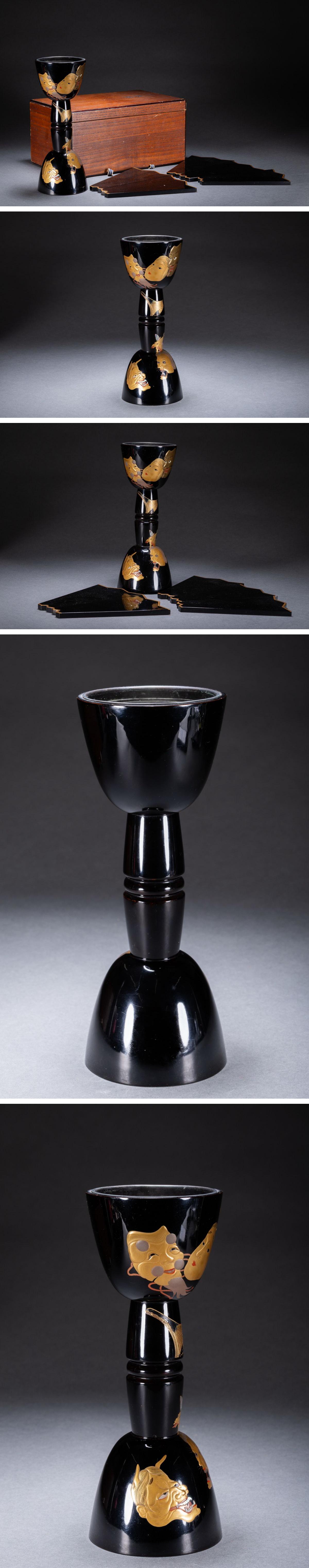 【清】時代和楽器 鉋目彫 黒漆塗 能面金蒔絵小鼓 一式 高26.5cm【理艶在銘】・蒔絵鼓胴 共箱 時代和楽器7L6-670S4