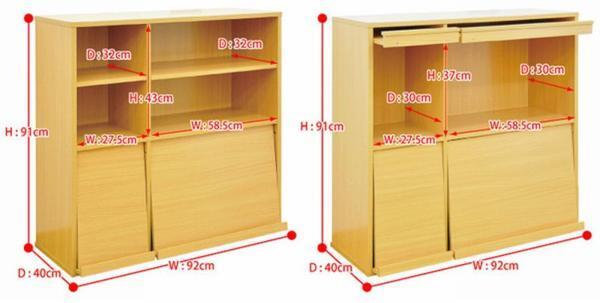 | 【カラー】 ナチュラル、ダークブラウン、ホワイト 【サイズ】 外寸:幅 92cm×奥行 40cm×高さ 91cm(1個あたり) (フラップなしタイプ) 内寸:[左]幅 27.5cm×奥行 32×高さ 43cm 内寸:[右]幅 58.5cm×奥行 32×高さ 43cm (フラップありタイプ) 内寸:[左]幅 27.5cm×奥行 30×高さ 37cm 内寸:[右]幅 58.5cm×奥行 30×高さ 37cm 【材質】 パーチクルボード、中密度繊維板(MDF)、プリント紙化粧合板 【生産国】 インドネシア 【梱包】 2梱包でお届けです。 サイズ (2-1):98.5×48×14.8cm (2-2):98.5×48×14.8cm 重量(合計):(約)45kg 【その他】 耐荷重:天板15kg、棚板5kg 【組み立て品】 お客様による組み立てが必要です。 |