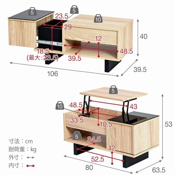 【カラー】 ブラウン×ブラック、ナチュラル×ブラック 【サイズ】 <外寸> リフト閉:幅80×奥行39.5×高さ40cm リフト開:幅80×奥行63.5×高さ53cm <内寸> 天板内収納部:幅43(最大48.5)×奥行33.5cm×高さ10.5cm オープン部:幅48.5×奥行39.5×高さ12cm 引き出し:幅29×奥行23.5×高さ18.5(最大23.5)cm 脚間:幅52.5×奥行34.5×高さ12cm 【材質】 本体:プリント紙化粧合板 脚・引き出し:合成樹脂化粧繊維板(PVC) スライド部天板:強化ガラス(5mm厚) 【耐荷重】 ガラス天板部:(約)5kg以下 デスク天板:リフト閉(約)10kg以下、リフト開(約)5kg以下 デスク天板内収納:(約)10kg以下 引き出し:(約)5kg以下 固定棚:(約)5kg以下 【生産国】 中国 【梱包】 サイズ:86.9×42.4×29.4cm、重量:21.4kg 【その他】 ・背面化粧あり ・脚裏フェルト付き 【組み立て品】 お客様による組み立てが必要です。 【ご注意】 ・サイズ、重量は概算です。 ・商品カラーはご使用のモニターによって実際の明るさや色と異なって見える場合がございます。 |