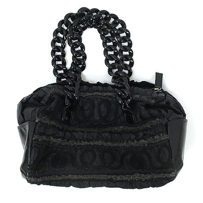 | 持ち手がチェーンになったユニークなバッグです。 ナイロンとエナメル調の素材切替がとってもお洒落☆ コンパクトながらマチがあり、たっぷり収納が可能です。 内ポケットが2つついています。 バッグ底と内側に使用感がございます。 幅約27cm 深さ約22cm マチ約14cm 持ち手約45cm 【サイズ】:(-) 【素 材】:(-) 【 色 】:(黒) 【程 度】:(B) **** 2507-20150409-014 499 075 | ||||