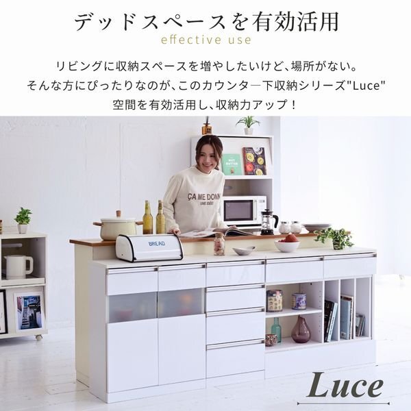 カウンター下のデッドスペースを有効活用できる収納シリーズ“Luce”。 鏡面仕上げで高級感をプラスするシンプルなキャビネット。 収納するものに合わせて棚位置を変えられる可動棚タイプ。 扉を閉めれば収納物が見えないので、見た目もすっきり。 |