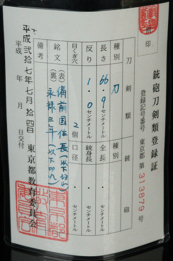 | ■刀剣のサイズ表示について 元幅・・・焼出し付近を測定しております 先幅・・・横手筋付近を測定しております 元重ね・・・焼出し付近の厚みを測定しております 先重ね・・・横手付近の厚みを測定しております (多少の誤差はご容赦ねがいます) ■銃砲類のサイズ表示について 全長・・・銃身先から台木尻までを測定しております 銃身・・・台木を除いて金属部分を測定しております (多少の誤差はご容赦ねがいます) 当社が出品する刀剣類は、入手した時の状態のまま出品しております。 ハバキ、小道具等も当社で調整したり付け替えたりはしておりませんので、合わせではないかというクレームは一切受け付けません。 刀身の疵も隠すことなく載せておりますので写真をよくご覧になってご入札ください。 疵に関して、説明がない等のクレームは一切受け付けません。 写真ではわかりにくい部分は質問欄やお電話でお問い合わせください。 但し、説明欄に表記のない刃切れに関してのみ返品やご相談に応じます。 ※ご落札しご購入されお手元に届いてから20日以内に 登録証に記載されている各都道府県の教育委員会にご連絡し 登録証の所有者変更を必ず行ってください | |||