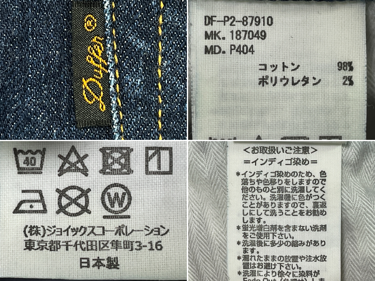 | ブランド:The DUFFER of St.GEORGE 型 番 :P404 カラー :インディゴ 状 態 :USED ザ ダファー ストレッチ スキニー デニムパンツ です。 高品質な岡山産デニム生地を使用し、体にフィットするスキニーシルエットのデニムパンツです。 色も濃く、ダメージ無くキレイな状態です。お探しの方お勧めの1本ですよ。 ■サイズ:製品表記 W30 ■サイズ:実寸(平置き) ウエスト 40.0cm (×2=約80cm) W31相当 股下 67.0cm 股上 25.0cm ワタリ 27.0cm すそ幅 16.0cm | ||