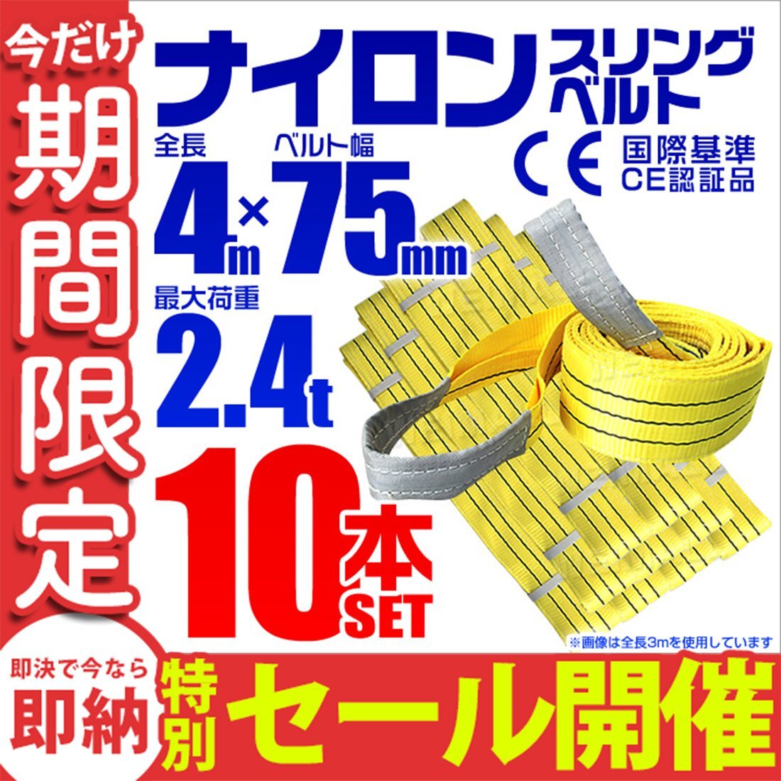 | 基本使用荷重2400kg(ストレート吊)/ 4800kg(バスケット吊)の荷役吊り上げベルトです。 ◎強度、耐荷、耐久性に優れているから安全性抜群 ◎軽いので扱いやすい ◎ヨーロッパが認めるCEマーク(欧州安全規制適合品) 取得商品 ◎ポリエステル100% ◎両端アイタイプ 運送業・自動車産業・建設業・倉庫業・造園業・港湾業・造船業・林業・石材業・荷役業など様々な作業にお使いください。 【仕様】 ベルトサイズ:長さ4m×幅75mm 材質:ポリエステル100% 最大使用荷重(能力):ストレート吊2400kg、チョーク吊1920kg、バスケット吊4800kg CE規格品 【内容】 ナイロンスリングベルト(耐荷2.4t 75mm×4m) ×10本 (スリングベルト ナイロンスリング ベルトスリング ナイロンスリングベルト 吊りベルト 吊り帯ベルト 荷吊りベルト 荷揚げ 荷締め ロープ 牽引 クレーンロープ クレーンベルト 運搬 おすすめ 送料無料) ※こちらの商品は元々伸縮性がある為、個体差がございまして長さに若干違いが生じることがございますが 返品交換の対象にはなりませんので、予めご了承ください。 |