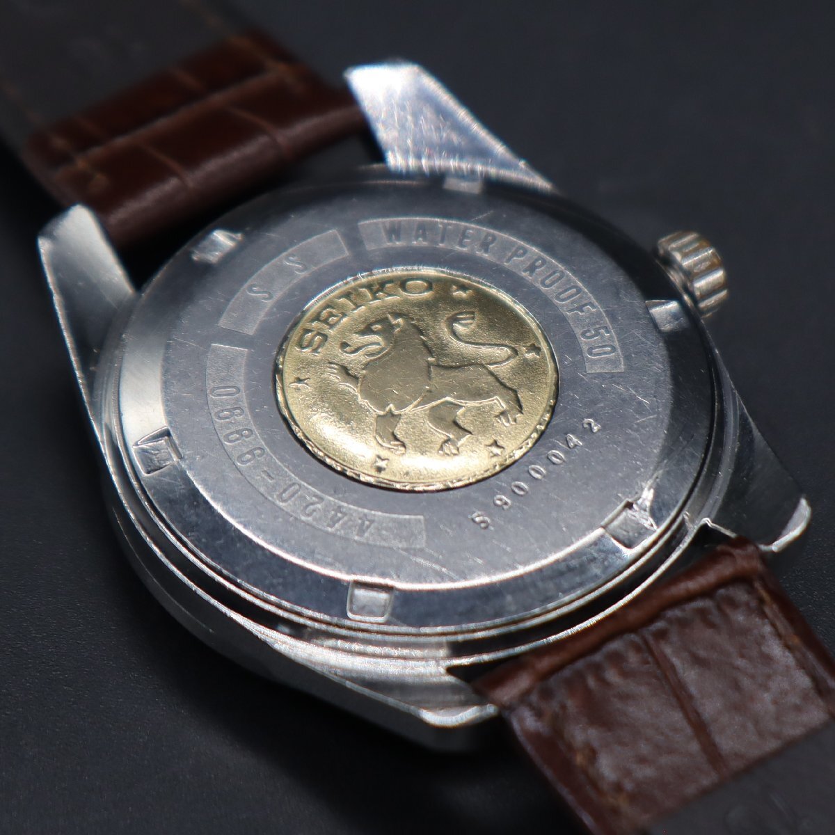 平置きで12時間動作確認済み、大幅な遅れなく稼働中です。 リューズ巻止まりOK、一段引きで時間調整可能です。 リューズは摩耗しておりロゴが消えておりますがおそらく純正品で、 操作にはとくに差しさわりございません。 ※アンティーク時計を長くお使いいただくため、 丁寧に、やさしく操作していただくようお願いいたします。 全体に経年のキズ、文字盤に小ヤケとチリ、丸くこすれた傷み、 植字ロゴやインデックス、針に経年の小汚れはございますが 風防表面は目視でキズ少なく、時計の視認性は良く保たれております。 「CHRONOMETER」「KING SEIKO」の印字、かすれなく良好です。 経年からすれば、全体としては良い状態のお品かと思います。 裏蓋獅子メダリオン、フチの小傷み程度で良好です。 周囲の刻印もしっかりと残っております。 希少なカマ付ムーブメントの個体です。画像7枚目をご参照ください。 ベルトは、新品の国内メーカー製革ベルトに交換済みですので すぐにお使い頂けます。 古い時計ですので、詳しくは画像にてご判断願います。 | |
